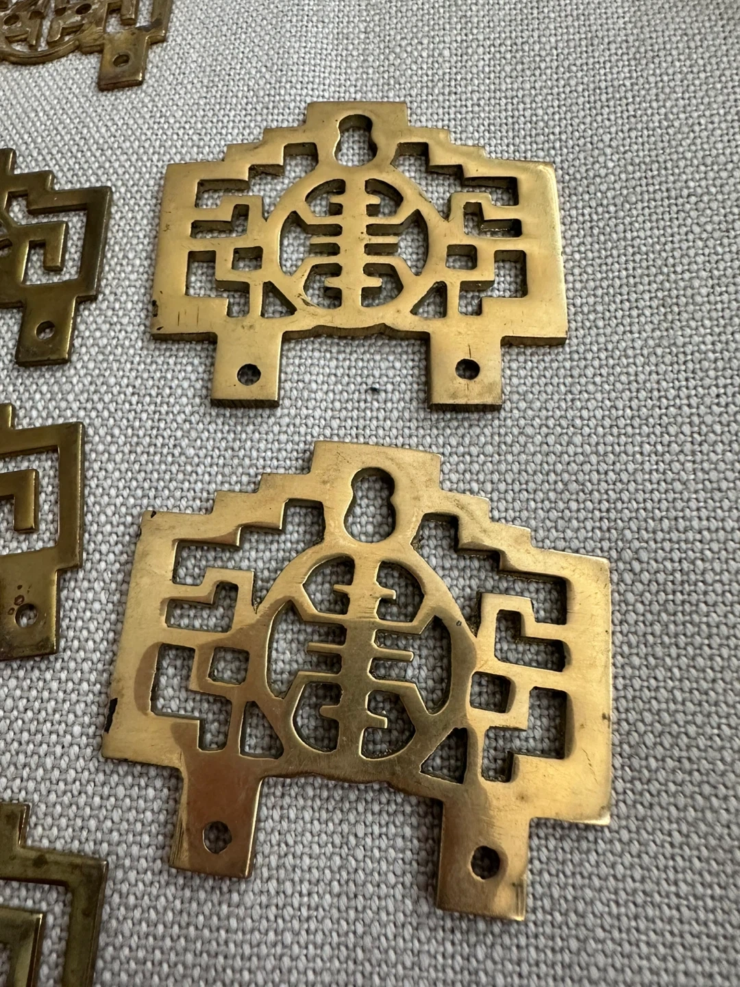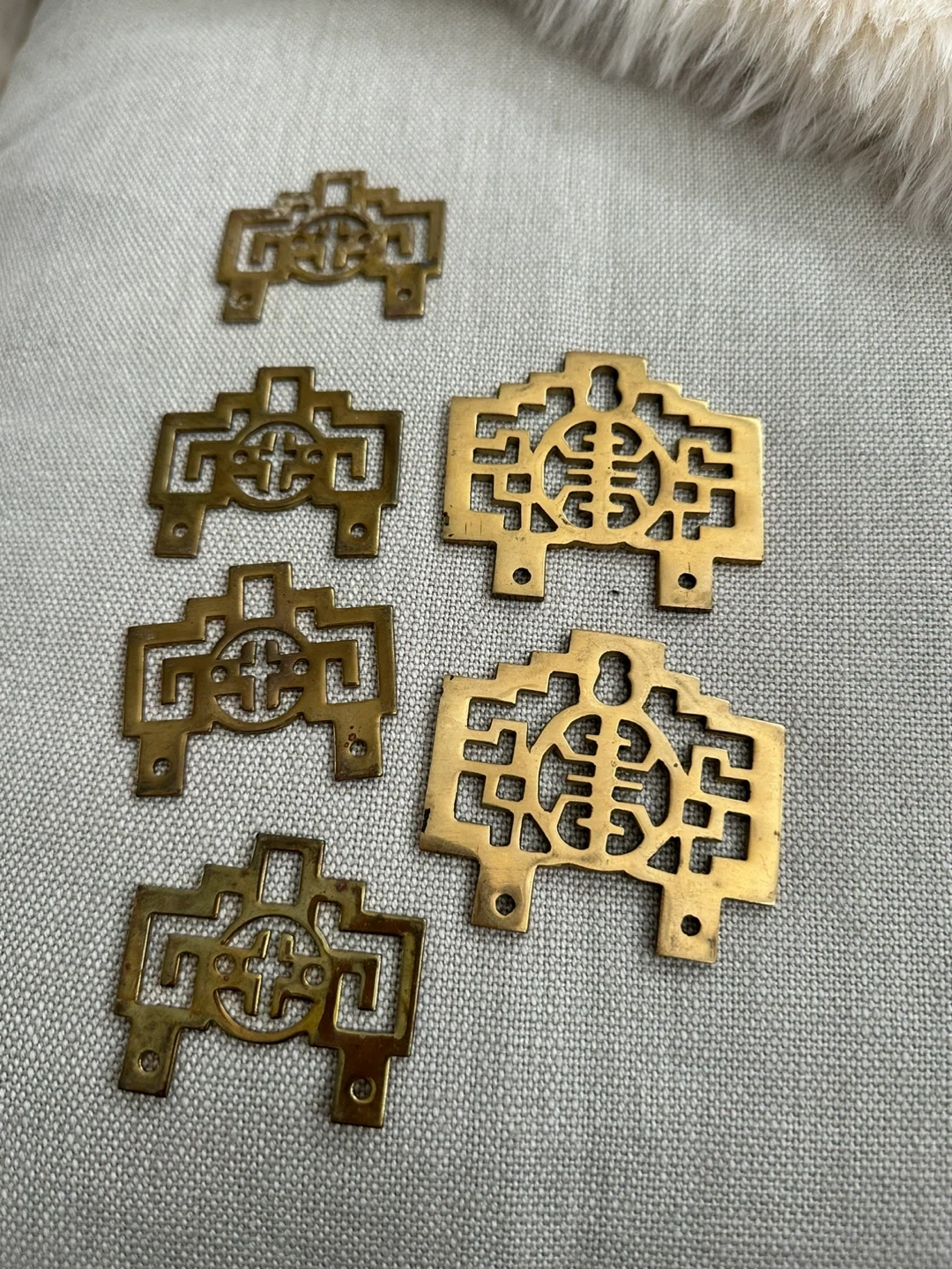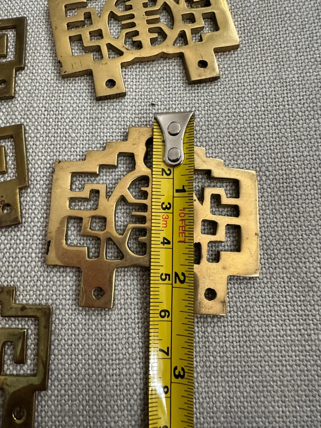 Set of 6 brass decorative accents with intricate cutout designs. Measure approximately 3.5 inches wide by 2.5 inches tall. Ideal for furniture embellishment or craft projects.
