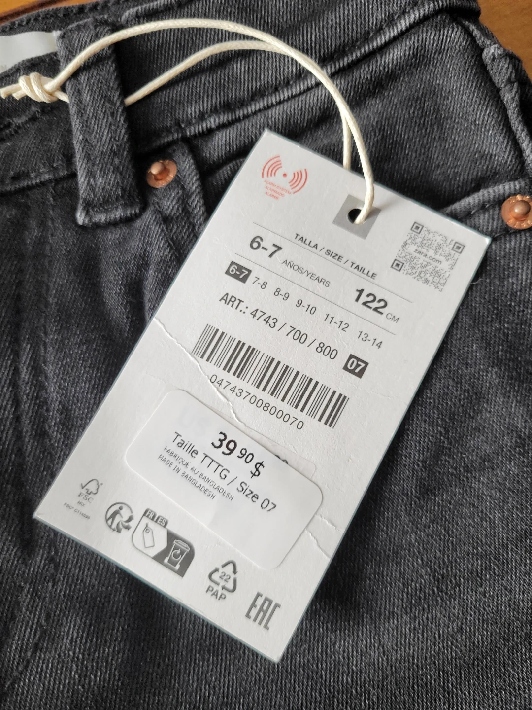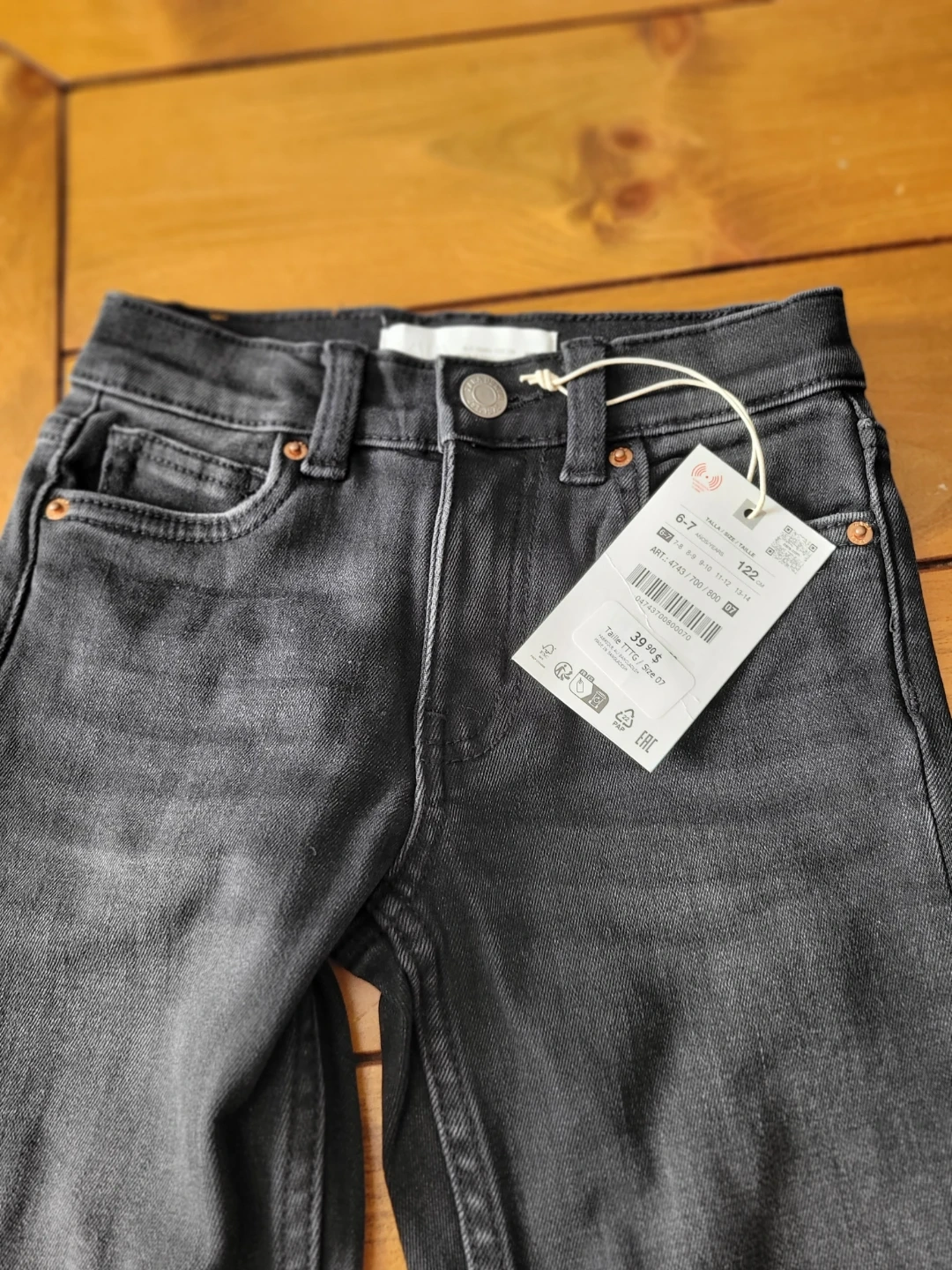 ZARA grey denim jeans for kids. Size 122 CM, which corresponds to ages 6-7 years. Made in Bangladesh.
