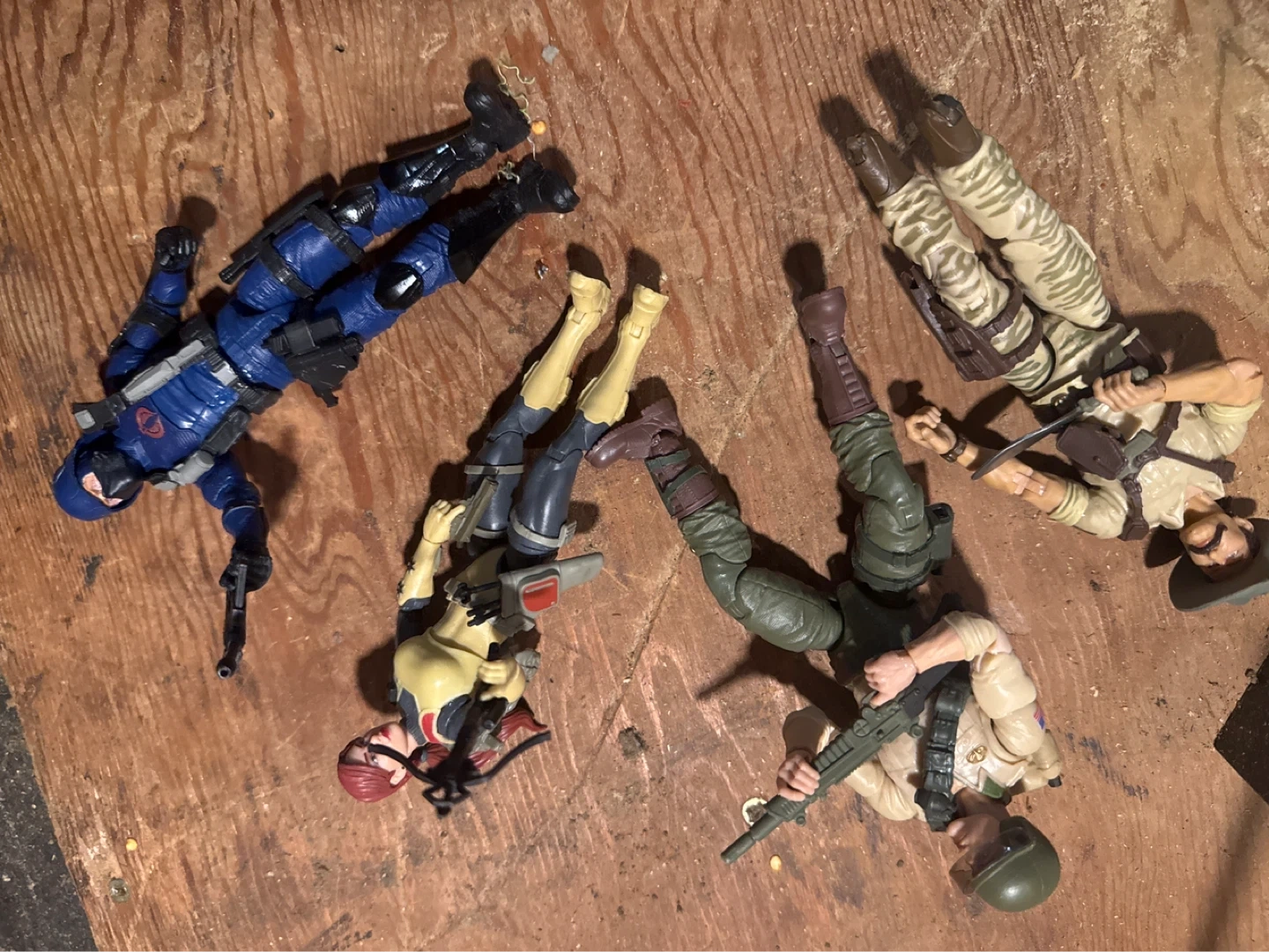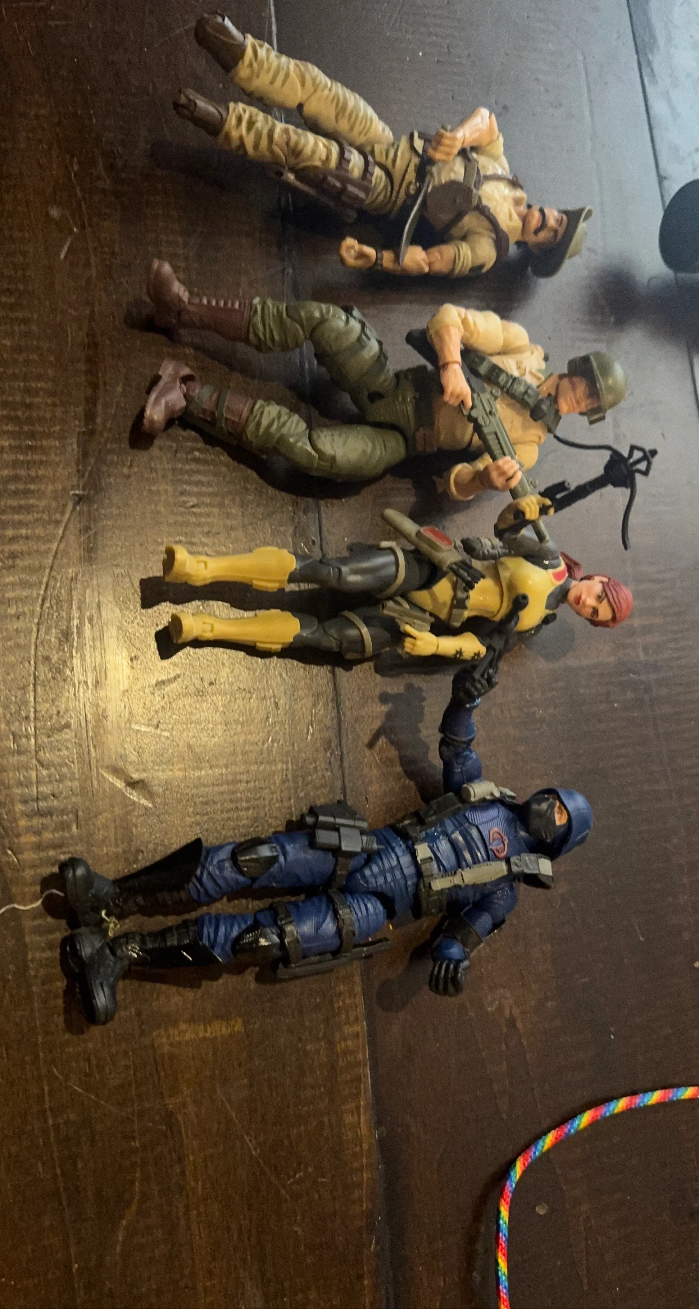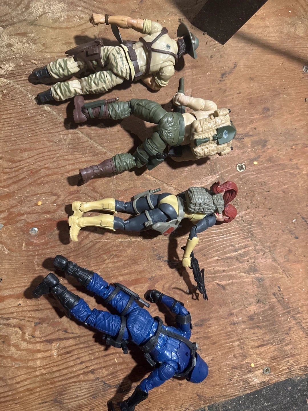 Four 6” G.I. Joe action figures, featuring characters in various military outfits. Each figure comes with accessories like weapons and gear. (1) figure has some damage(in the 2nd individual character pic. You can see NO COMPLETE FEET. He lost them to gangrene due to frostbite. It doesn’t hinder him a bit)These are collectible action figures for display or play.