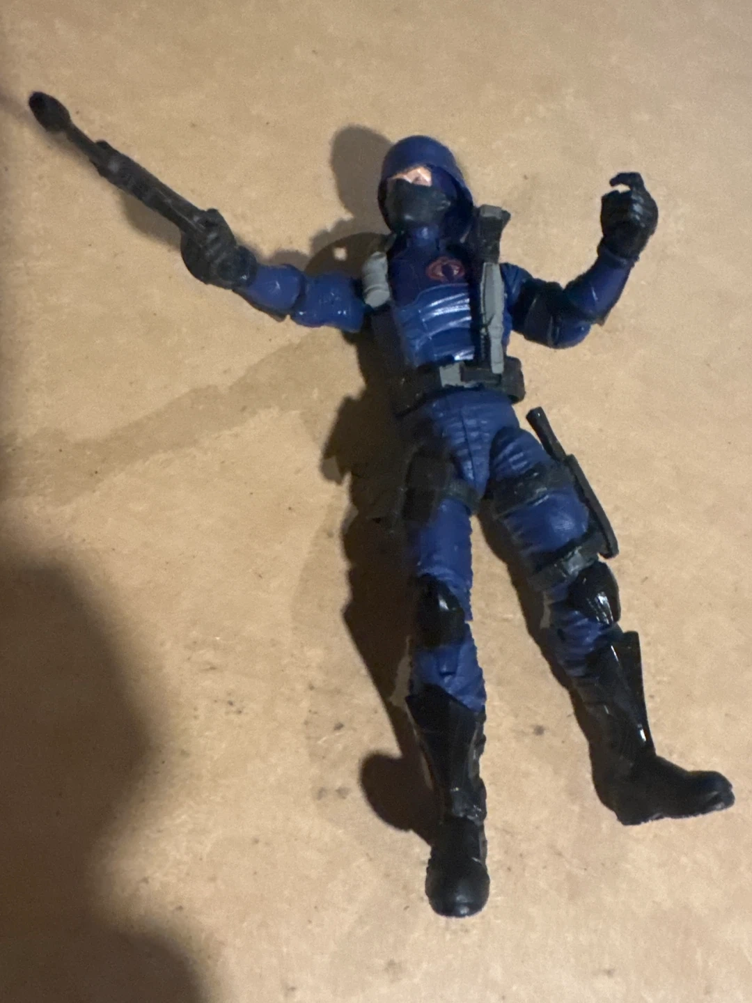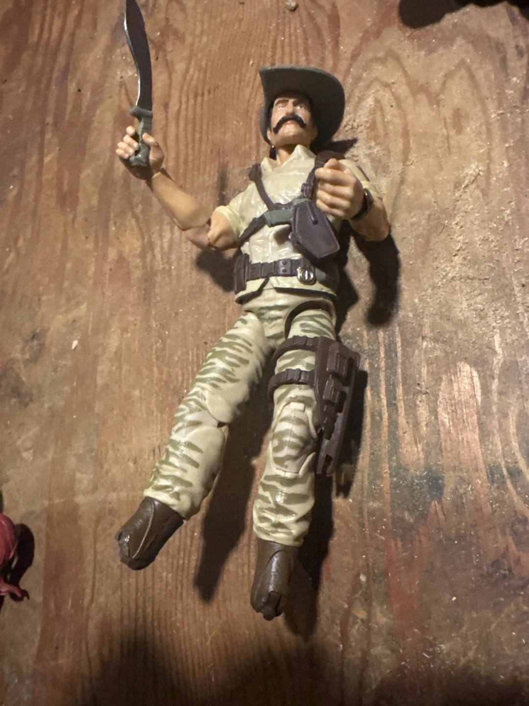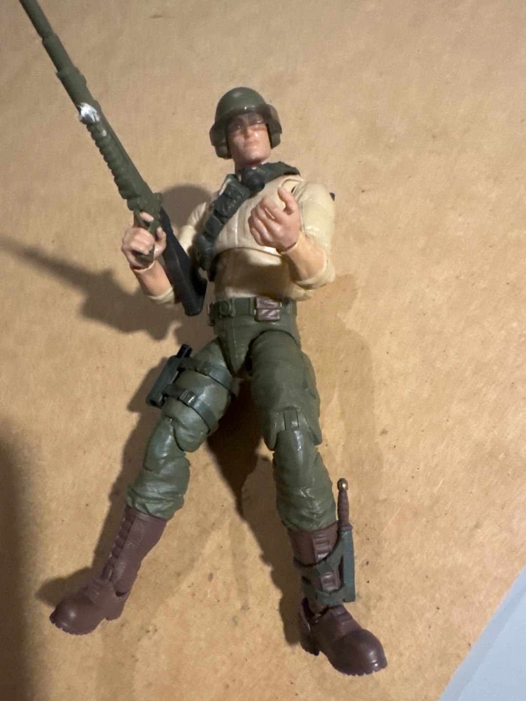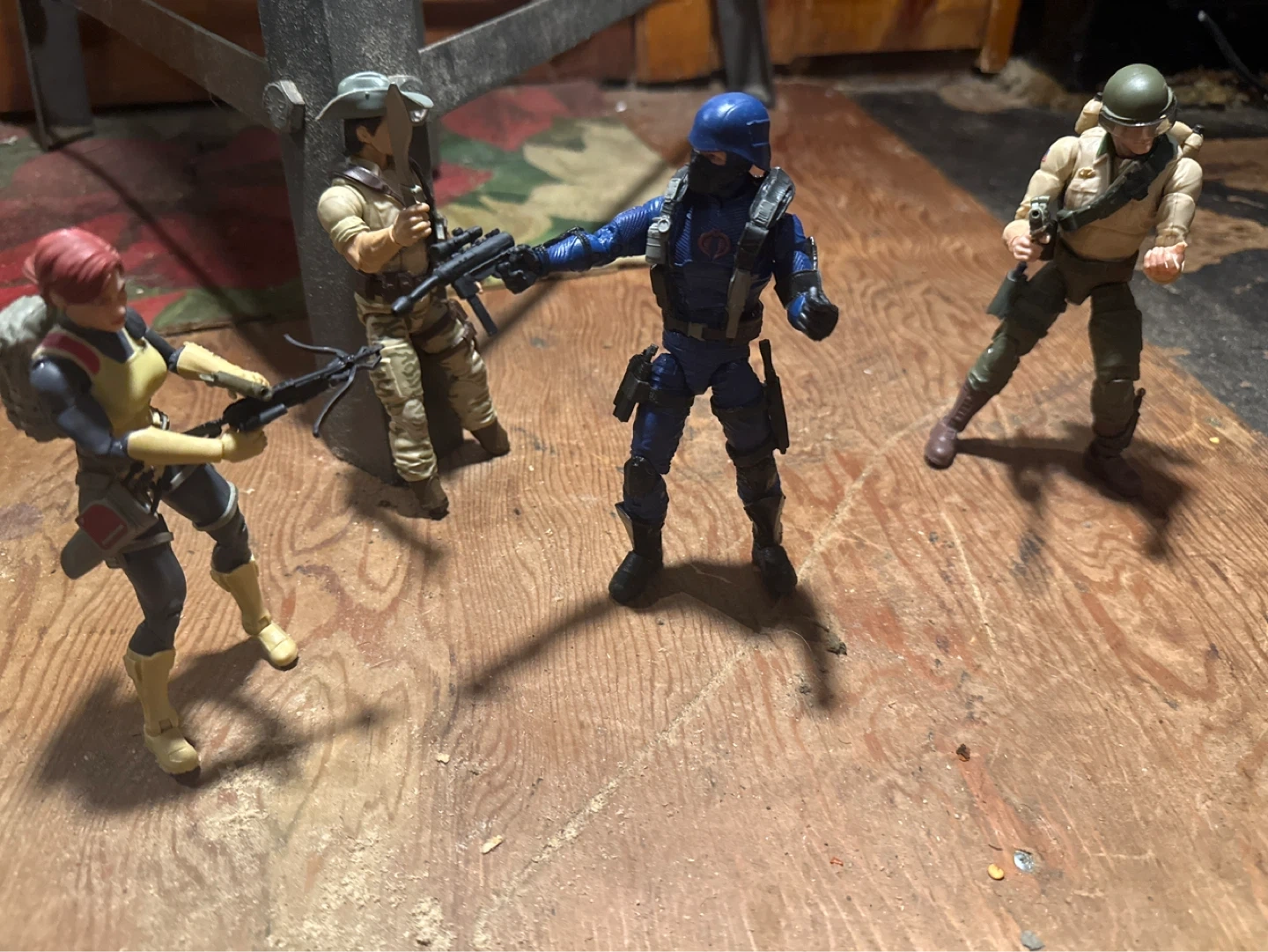 Four 6” G.I. Joe action figures, featuring characters in various military outfits. Each figure comes with accessories like weapons and gear. (1) figure has some damage(in the 2nd individual character pic. You can see NO COMPLETE FEET. He lost them to gangrene due to frostbite. It doesn’t hinder him a bit)These are collectible action figures for display or play.