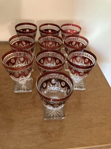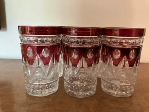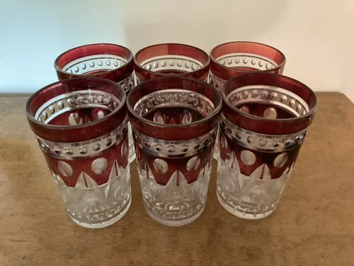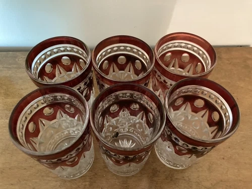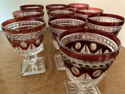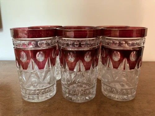 This is a vintage set of Indiana Glass Colony Park Lane Ruby Red glassware, featuring 22 pieces in total. The rich red hue and Colonial style make this a beautiful addition to any bar or dining area.