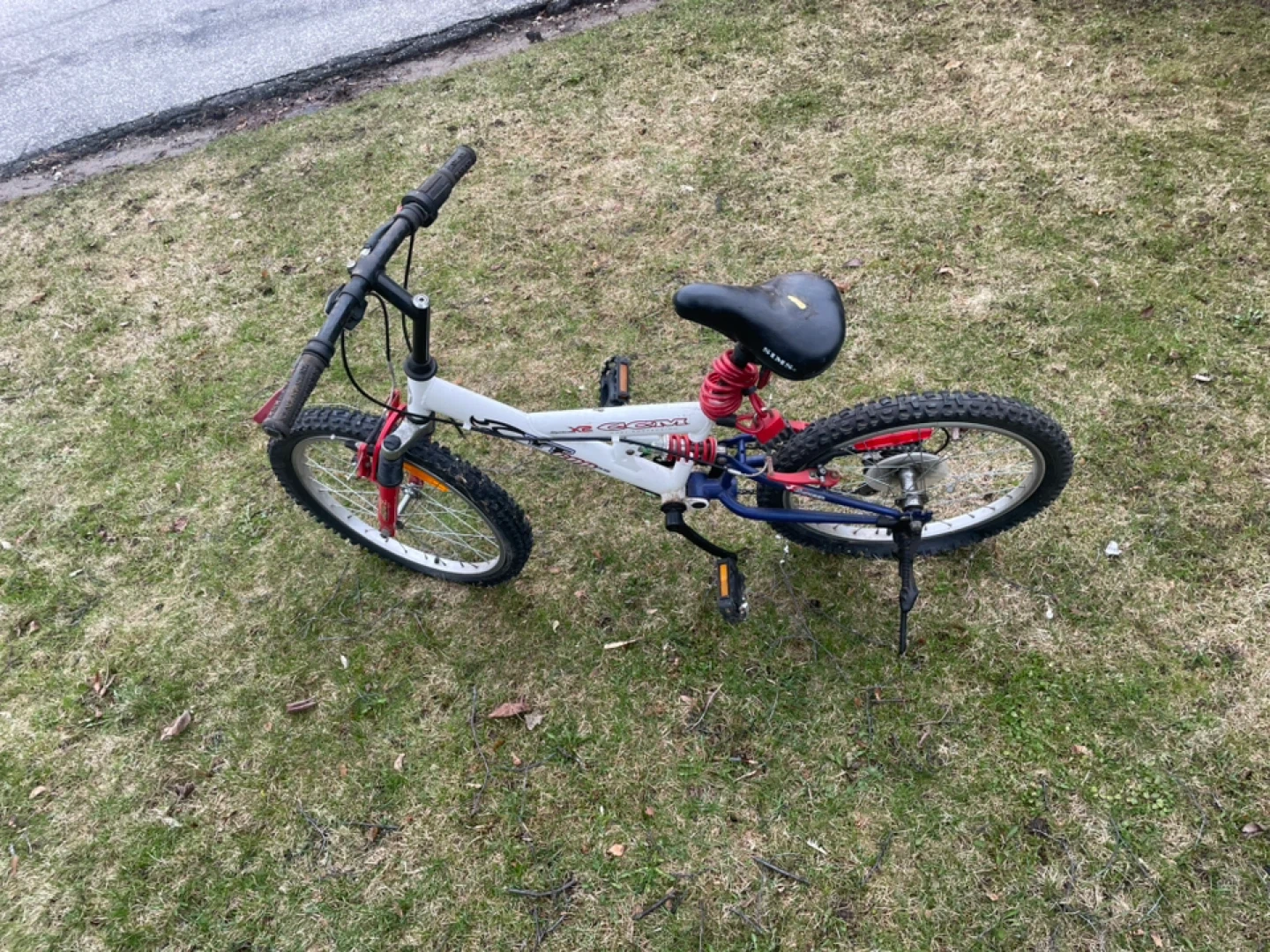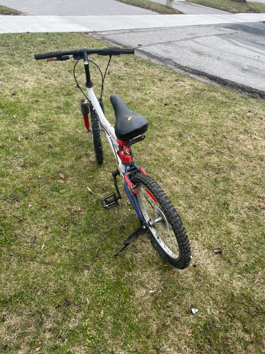 This CCM "Traction" mountain bike is white with red and blue accents. It features front suspension and a durable frame. Ready for your next adventure!