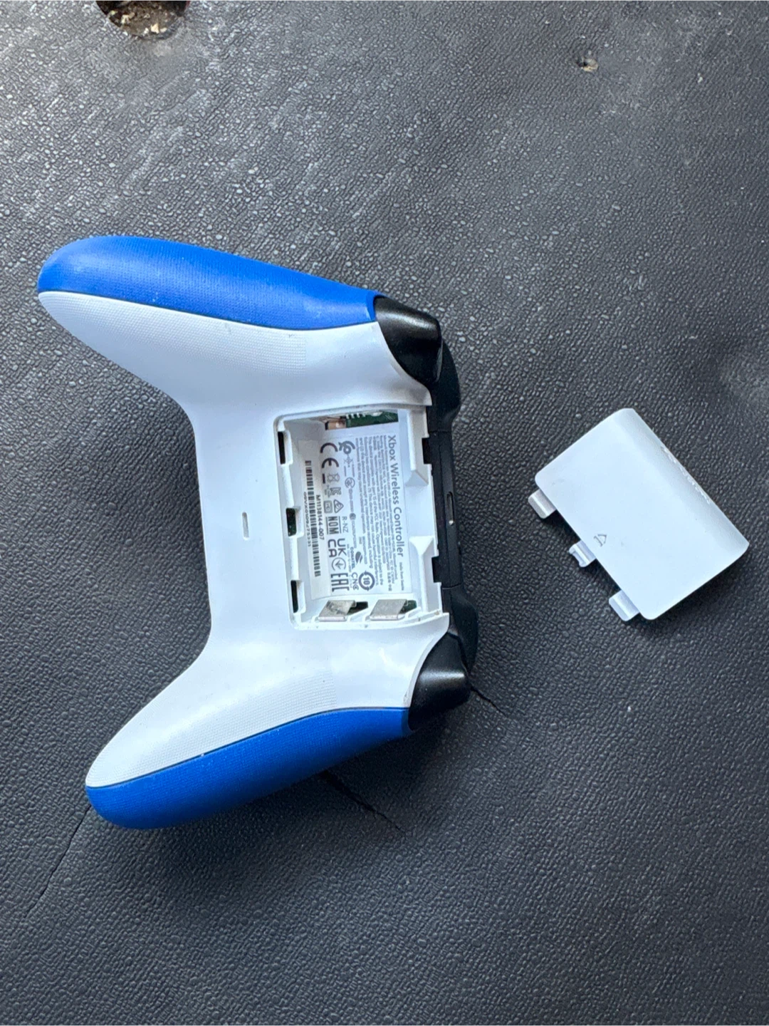 This is an Xbox wireless controller in blue and white. It's the standard size for Xbox controllers. It connects wirelessly and uses AA batteries, with a battery compartment cover included. This controller is ready for your next gaming session!