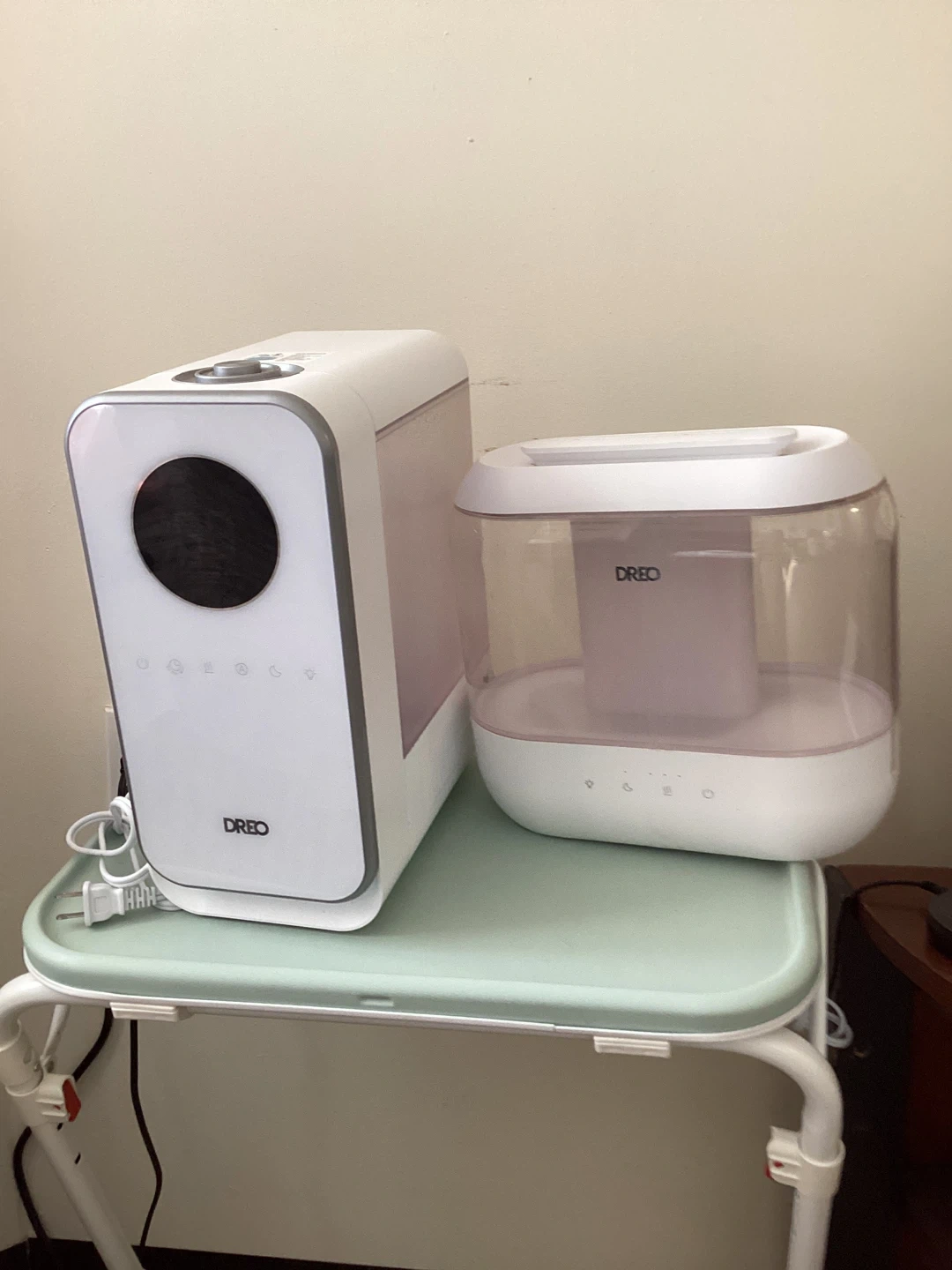 This is a Dreo humidifier. It's white and has a clear water tank. The unit has a digital display and control panel.