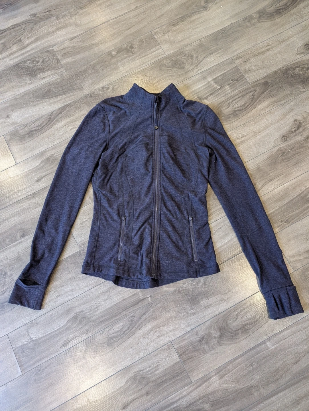 Lululemon zip-up jacket. It's a size 6. This athletic top has thumbholes and zippered pockets. It's made of a comfortable, breathable fabric.
