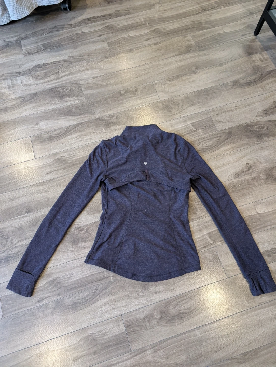 Lululemon zip-up jacket. It's a size 6. This athletic top has thumbholes and zippered pockets. It's made of a comfortable, breathable fabric.