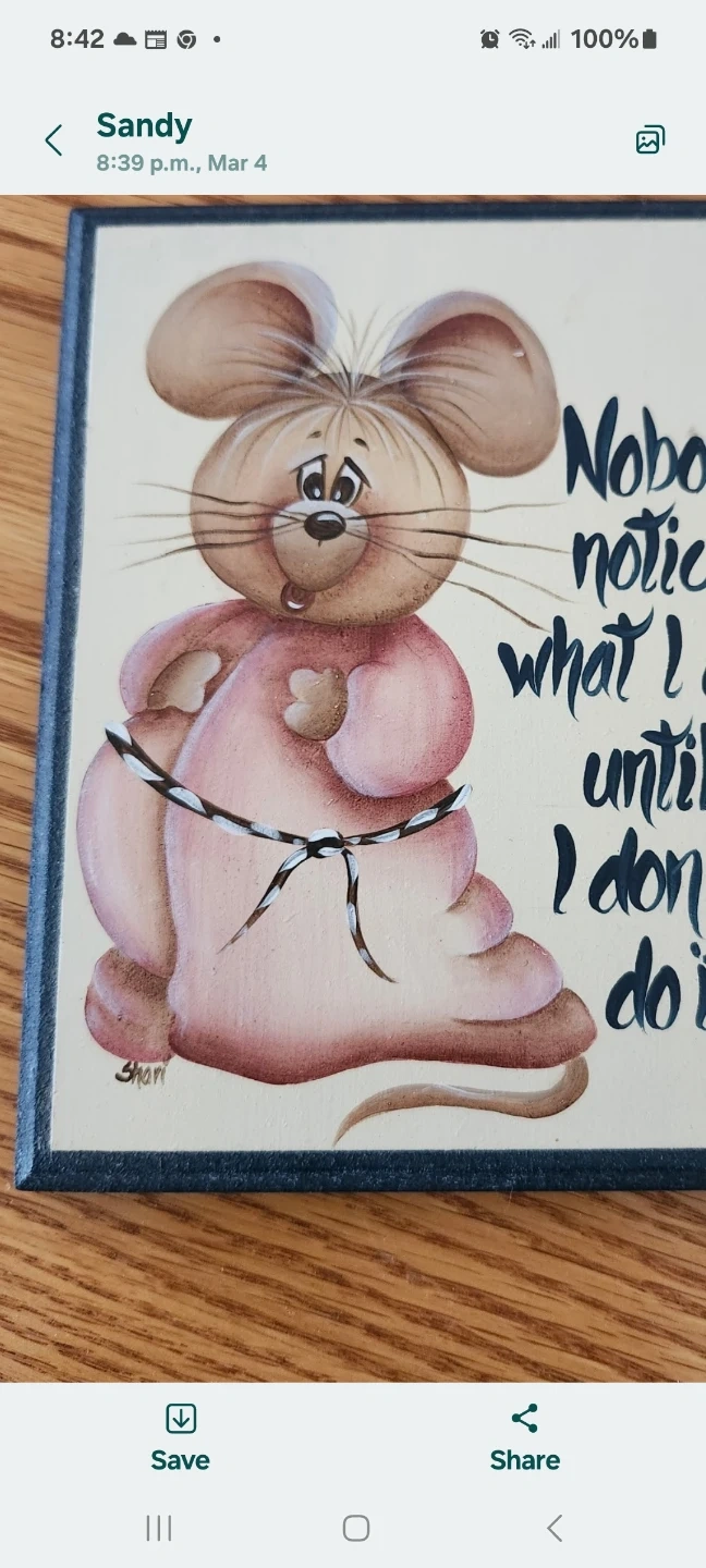 This is a charming hand-painted plaque featuring a whimsical mouse. The artwork is signed 'Shari' and includes the quote 'Nobody notices what I do until I don't do it!'. It's a fun decorative piece for any home.