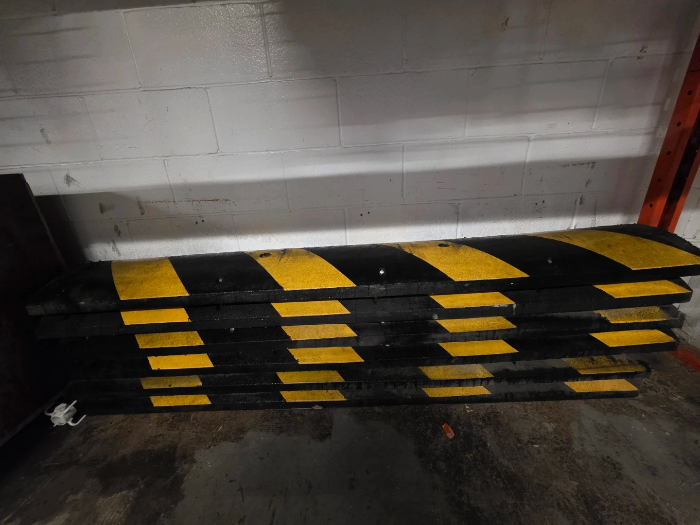 Set of black and yellow rubber speed bumpers.