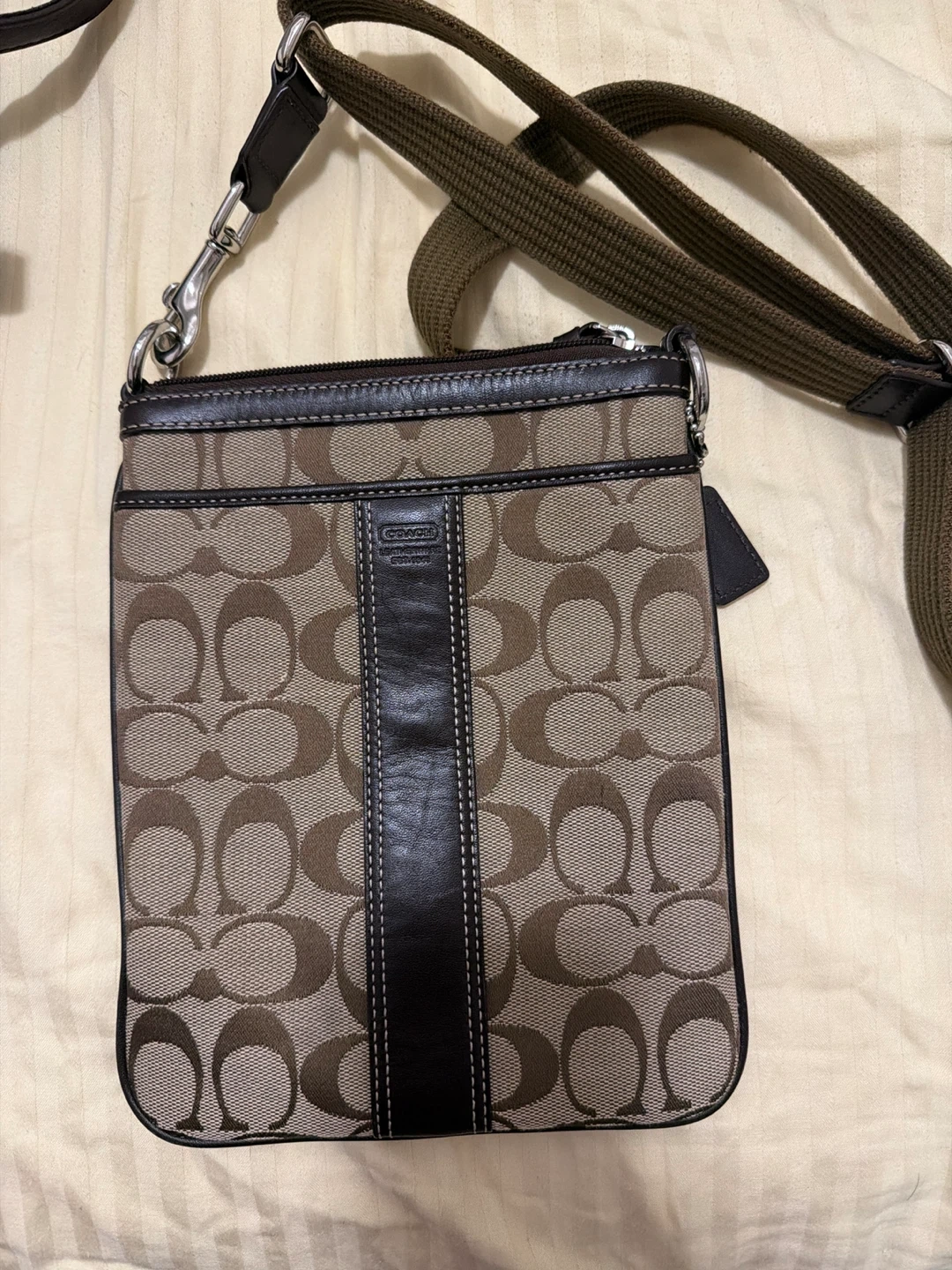 This is a Coach crossbody bag with the signature monogram pattern. It's made of coated canvas and leather trim. The adjustable strap provides comfortable wear.