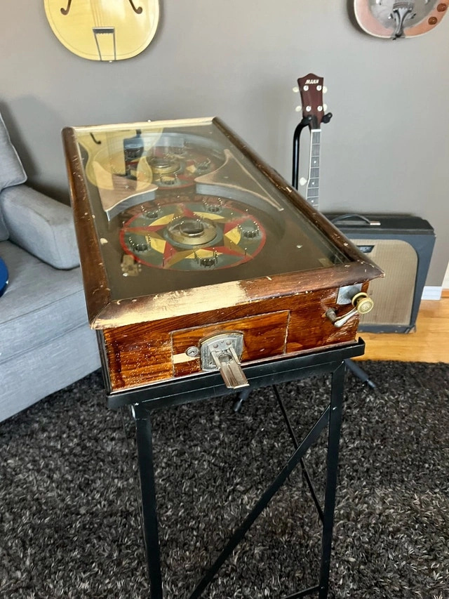 Step back in time with this Five Star Final, a true gem in the world of vintage pinball machines, produced by Gottlieb, D. & Co. in 1932. As one of the earliest pinball machines ever made, this piece is not just a game—it’s a slice of history. Features: Manufacturer: Gottlieb, D. & Co. Year of Production: 1932 Type: Non-electric pinball game with mechanical scoring. Theme: Named after the famous Broadway play “Five Star Final.” Gameplay: Skill-based manual play with original plunger and scoring system intact.
