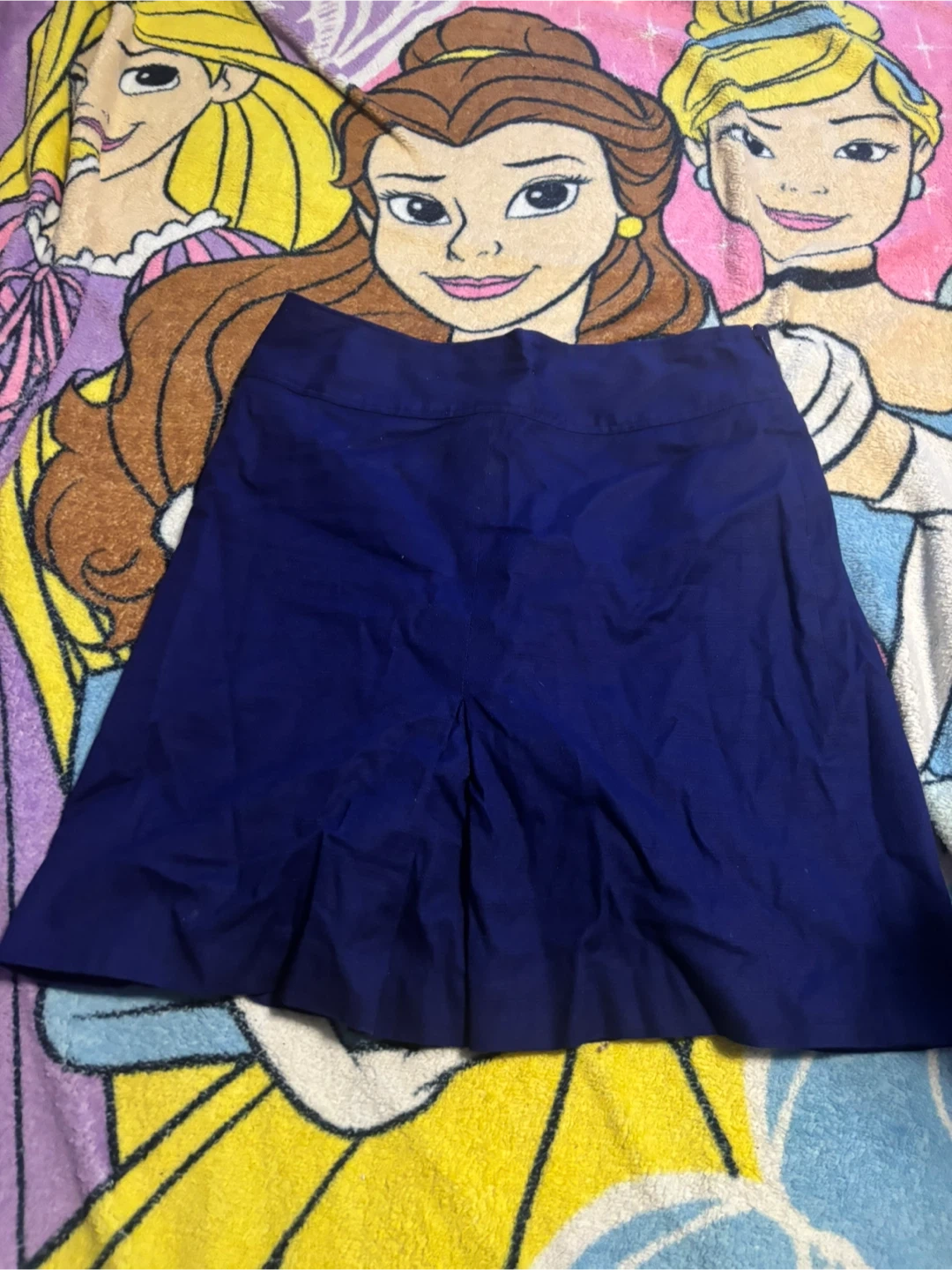 A navy blue A-line skirt from Banana Republic. It's a size 8 with a zipper closure. This skirt is made from a textured fabric.
