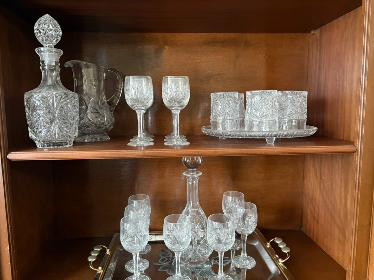 Beautifully detailed crystal glass set. Includes two decanters, jug, with stopper, a pitcher, serving tray, and multiple stemmed glasses and tumblers. Perfect for serving drinks at gatherings! Pick up Dufferin/glencairn