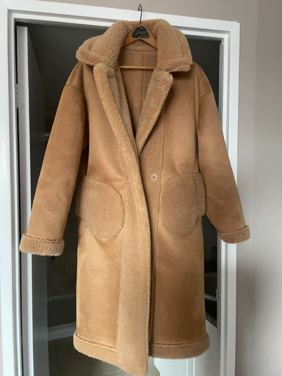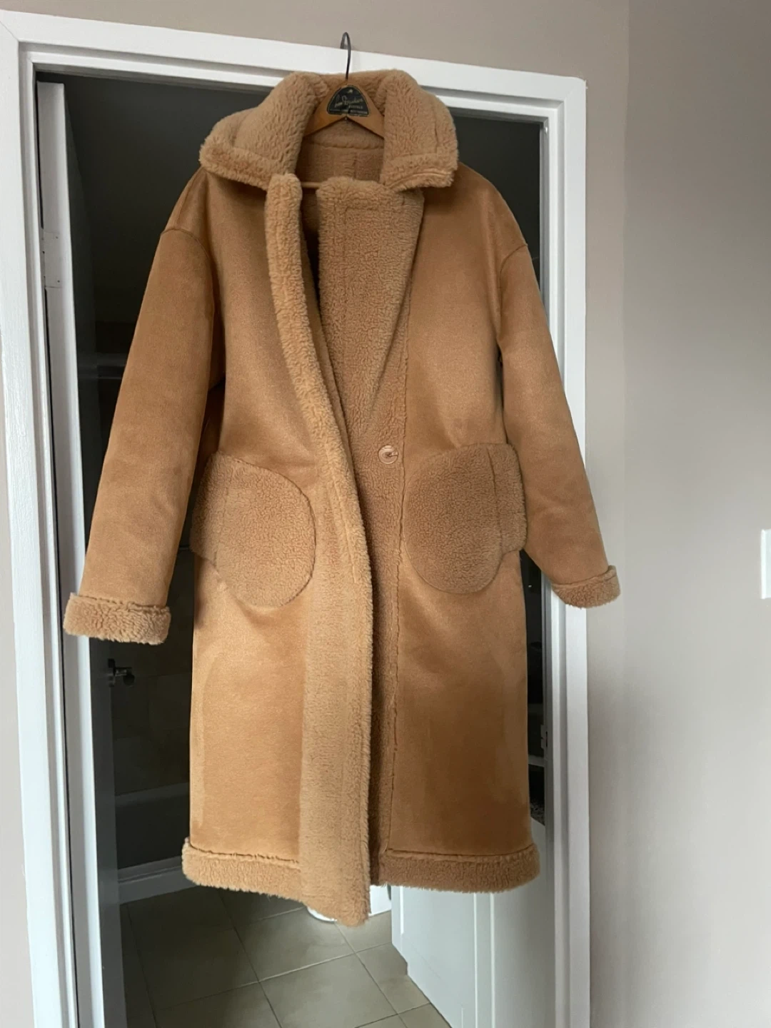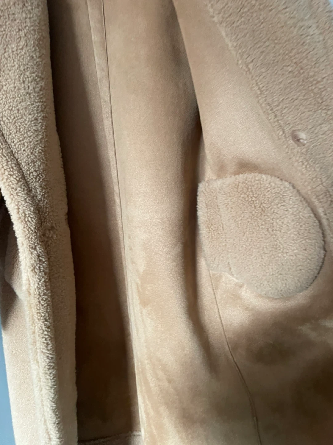This cozy teddy bear fleece coat is a stylish and warm option for cooler weather. It features a classic collar, button closure, and two front pockets. The material is soft fleece, perfect for staying snug. It's a versatile piece that can be dressed up or down! Purchased from Maska, downtown Oakville. Retailed for $550
