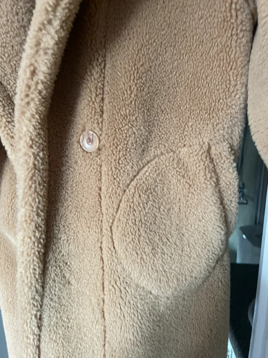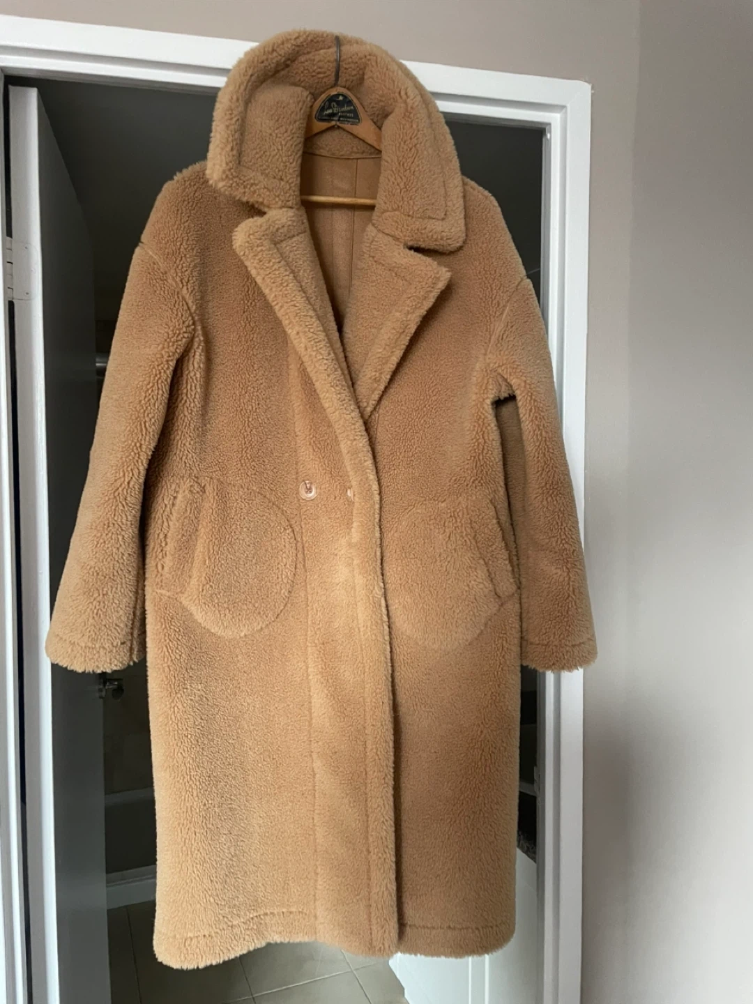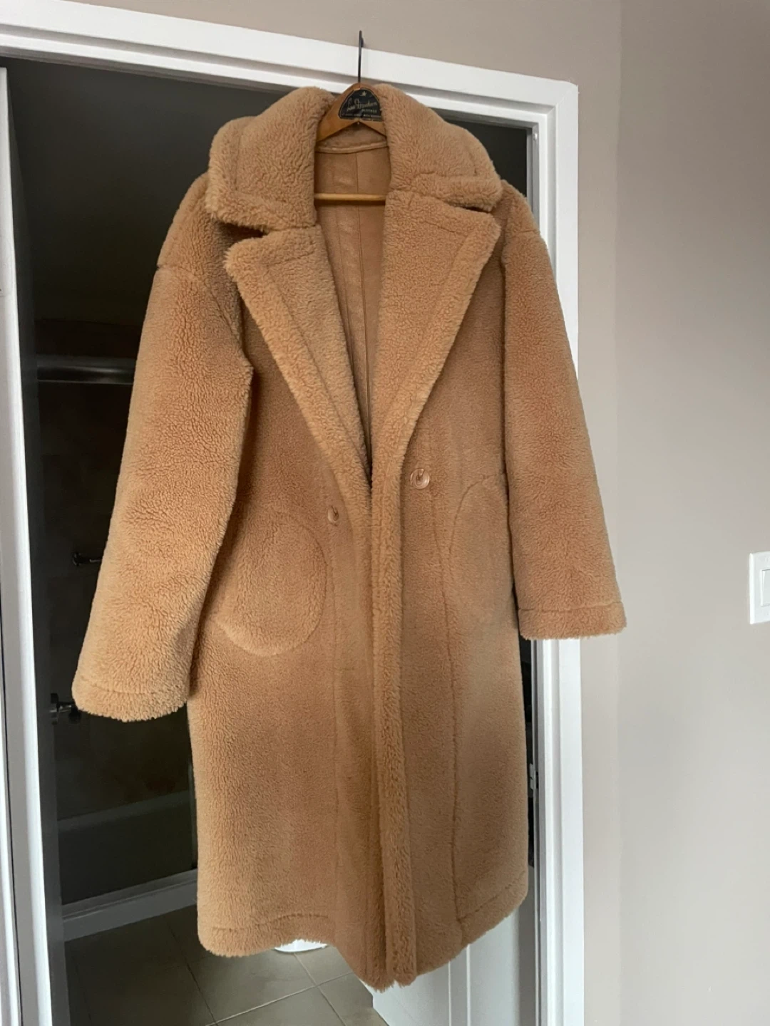 This cozy teddy bear fleece coat is a stylish and warm option for cooler weather. It features a classic collar, button closure, and two front pockets. The material is soft fleece, perfect for staying snug. It's a versatile piece that can be dressed up or down! Purchased from Maska, downtown Oakville. Retailed for $550