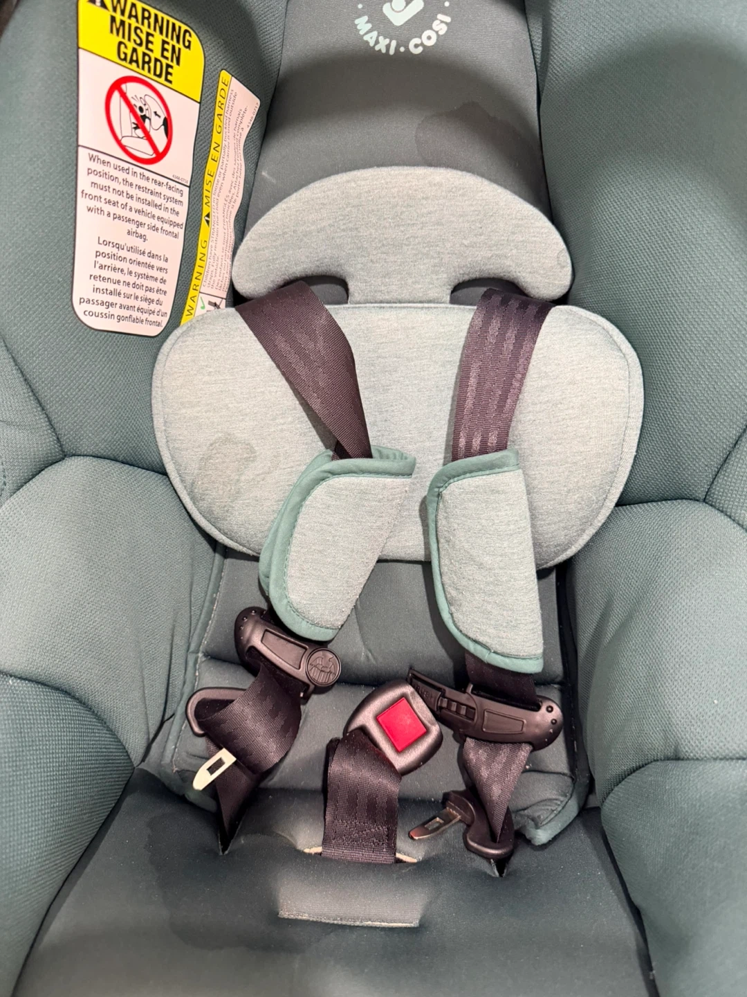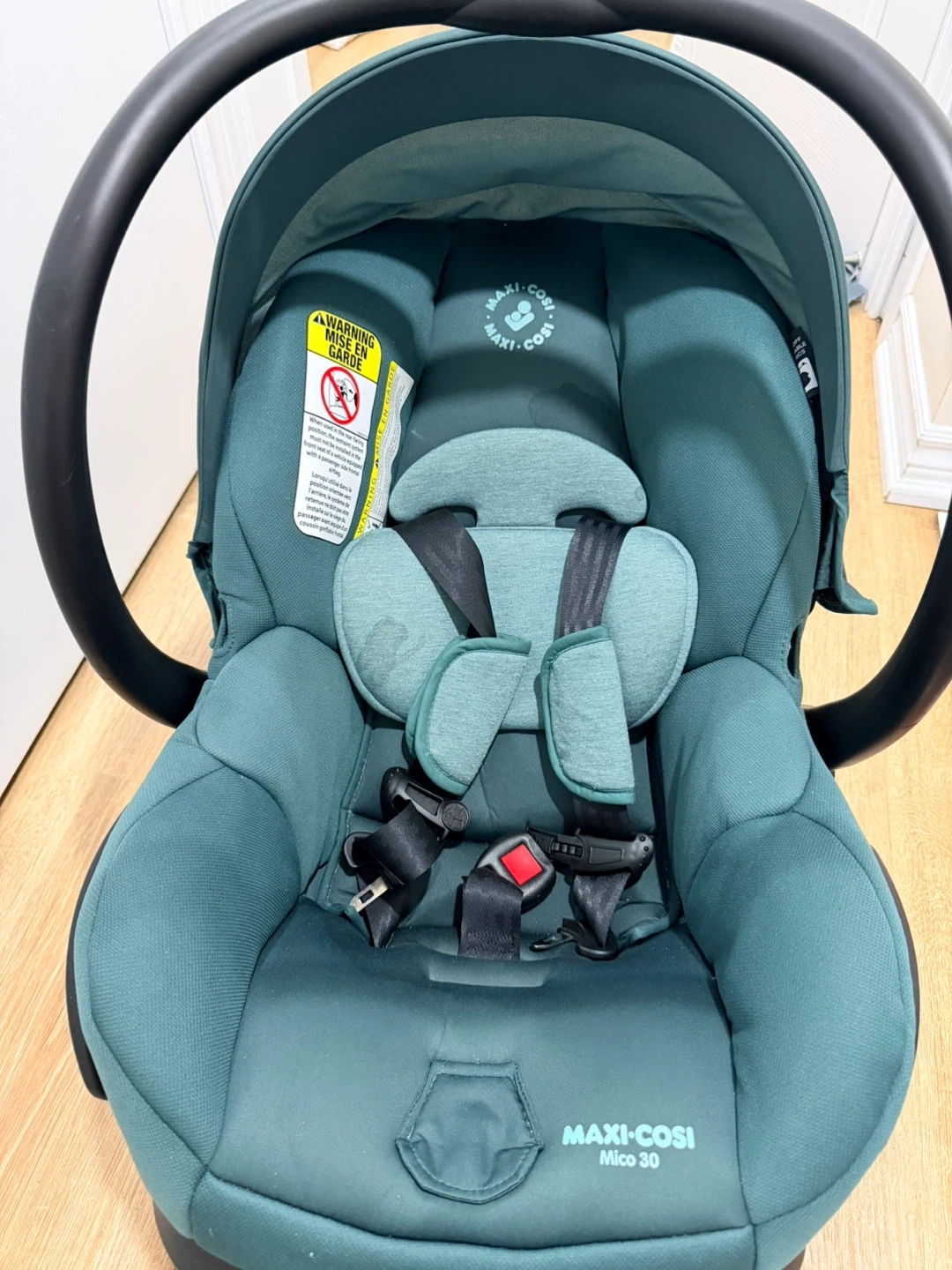 This Maxi-Cosi Mico 30 infant car seat is designed for safety and comfort. It features a plush seat with a 5-point harness for secure restraint. Teal green colour.