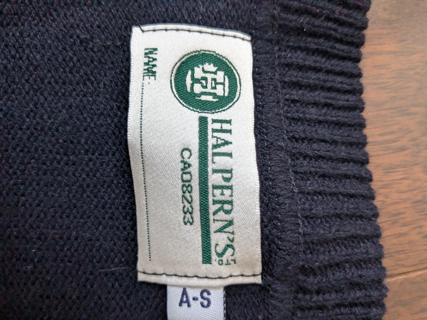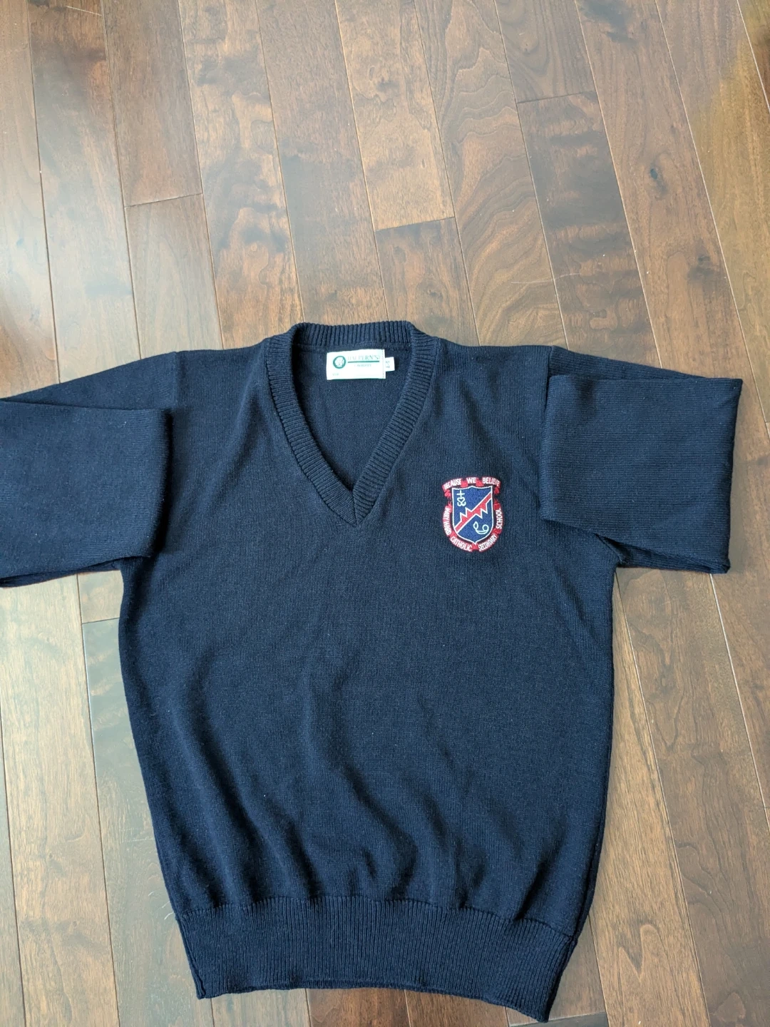Selling a Mary Ward CSS Navy V-neck sweater from Halpern's. It's a size A-S. It is in excellent condition with no tears, stains or holes.