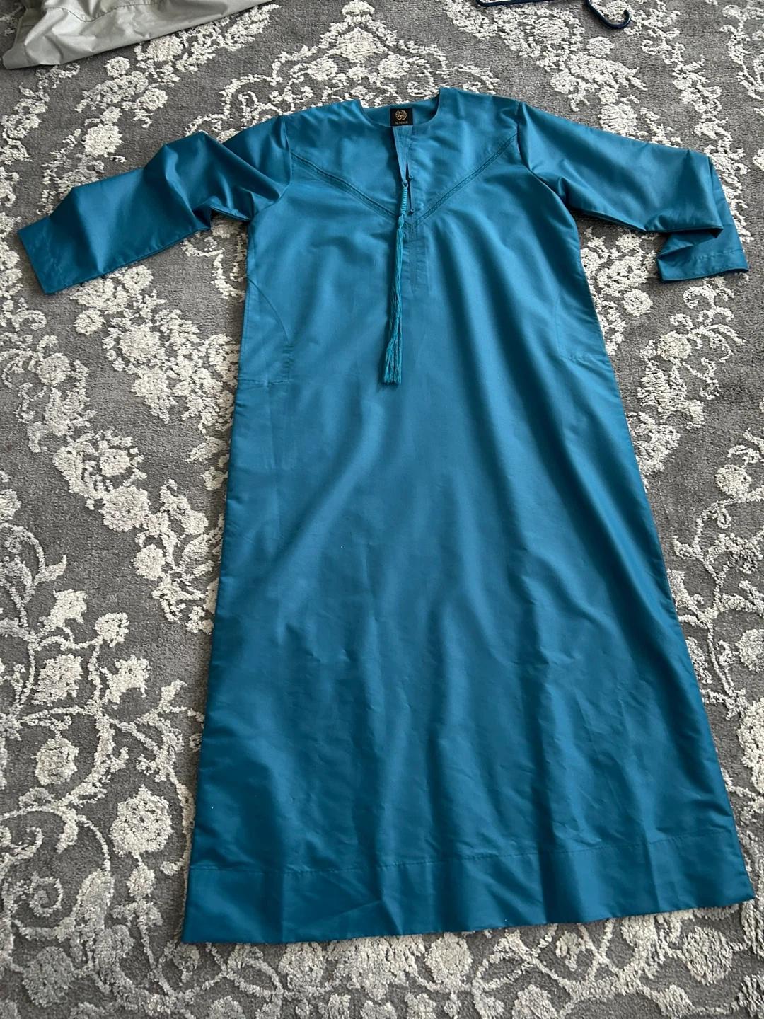 This men's thobe is a lovely teal colour. It features intricate stitching details on the chest and a decorative tassel. Made from a smooth fabric, it's perfect for formal or casual wear.