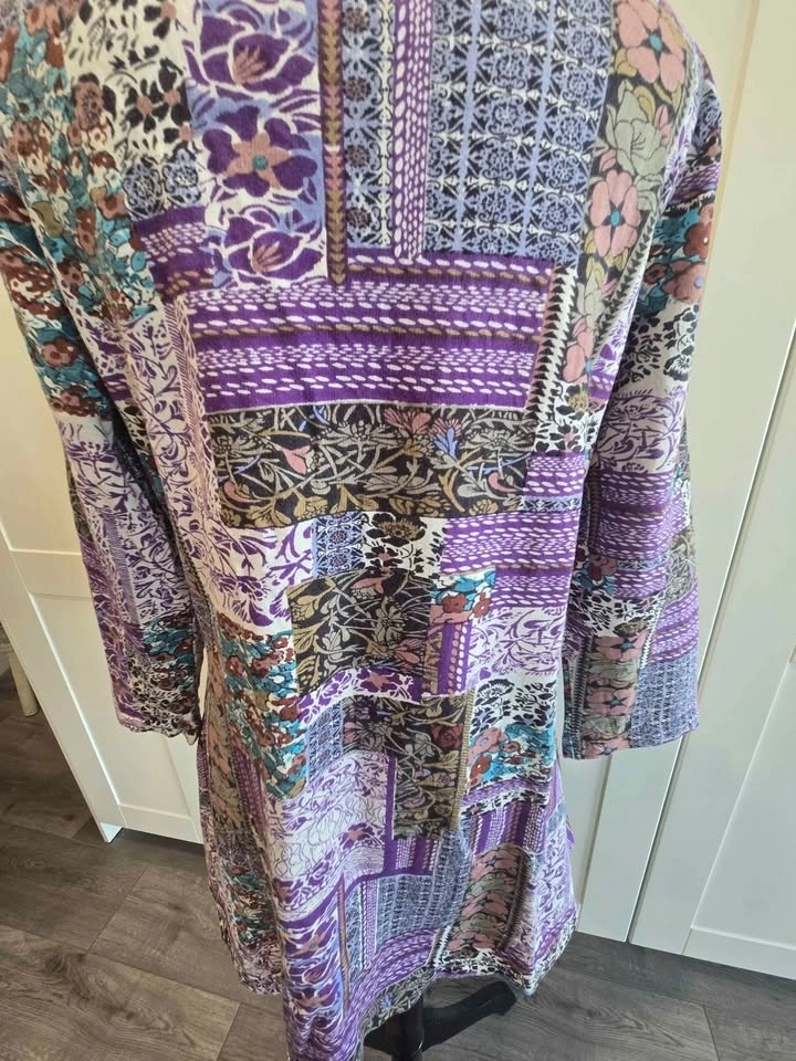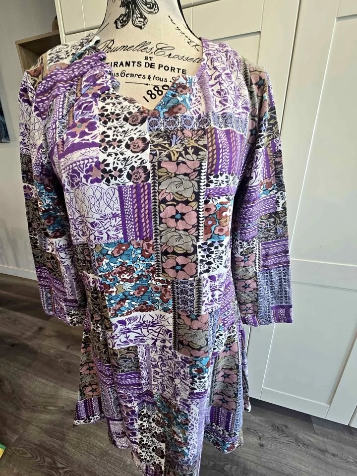 Super cute dress with a nice neckline. Size medium with 3/4 length sleeves and knee length. I can provide measurements if needed.