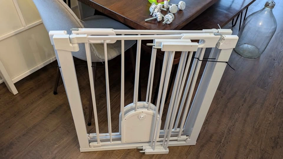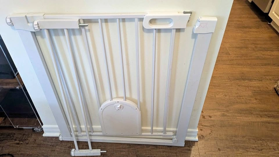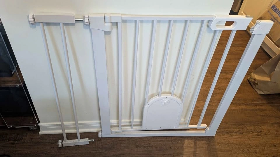 Includes a door for your cat or small dog. One gate has minor damage near the white zip tie, but it doesn't affect its function. Selling 2 for $85, or 1 for $50.