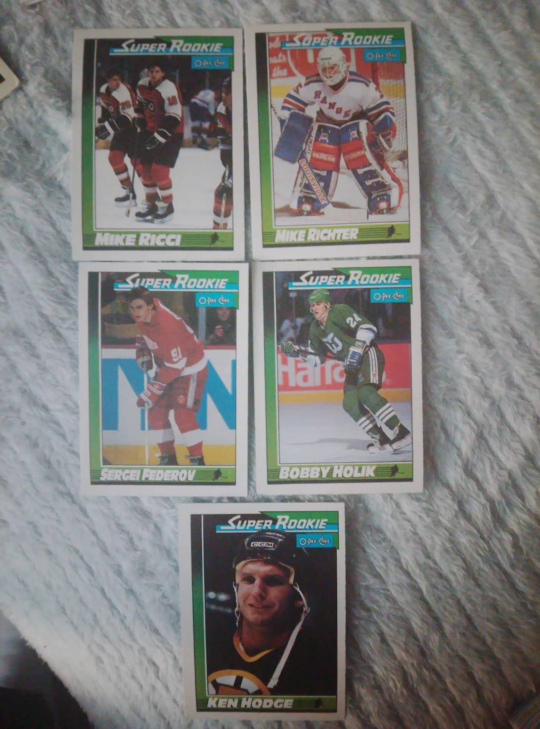 Collection of five O-Pee-Chee Super Rookie hockey cards. Includes Mike Ricci, Mike Richter, Sergei Fedorov, Bobby Holik, and Ken Hodge. Cards feature player stats and team information on the back.