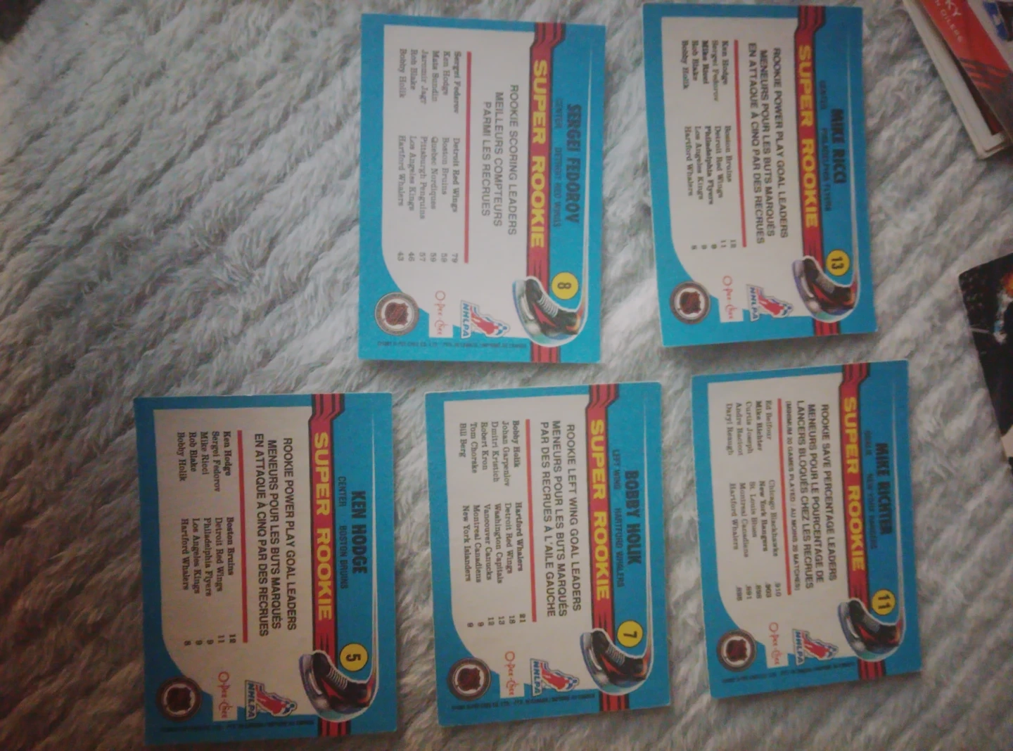 Collection of five O-Pee-Chee Super Rookie hockey cards. Includes Mike Ricci, Mike Richter, Sergei Fedorov, Bobby Holik, and Ken Hodge. Cards feature player stats and team information on the back.