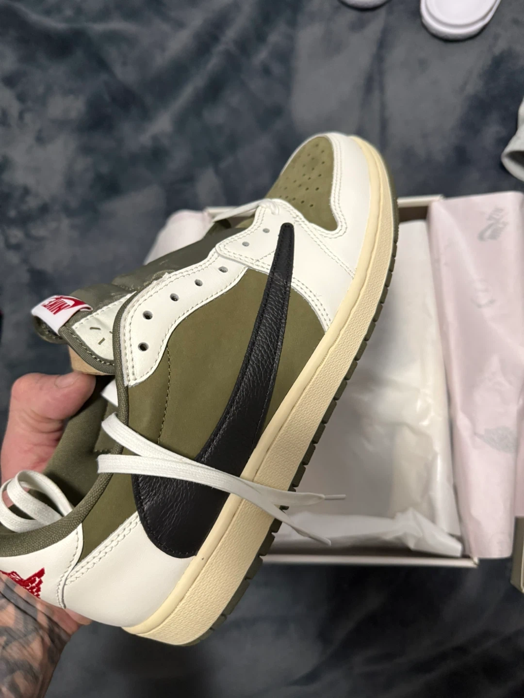 These are the Nike Air Jordan 1 Low OG SP Travis Scott sneakers in the Olive colourway. They come with their original box and packaging paper. A classic collaboration for any sneaker enthusiast!