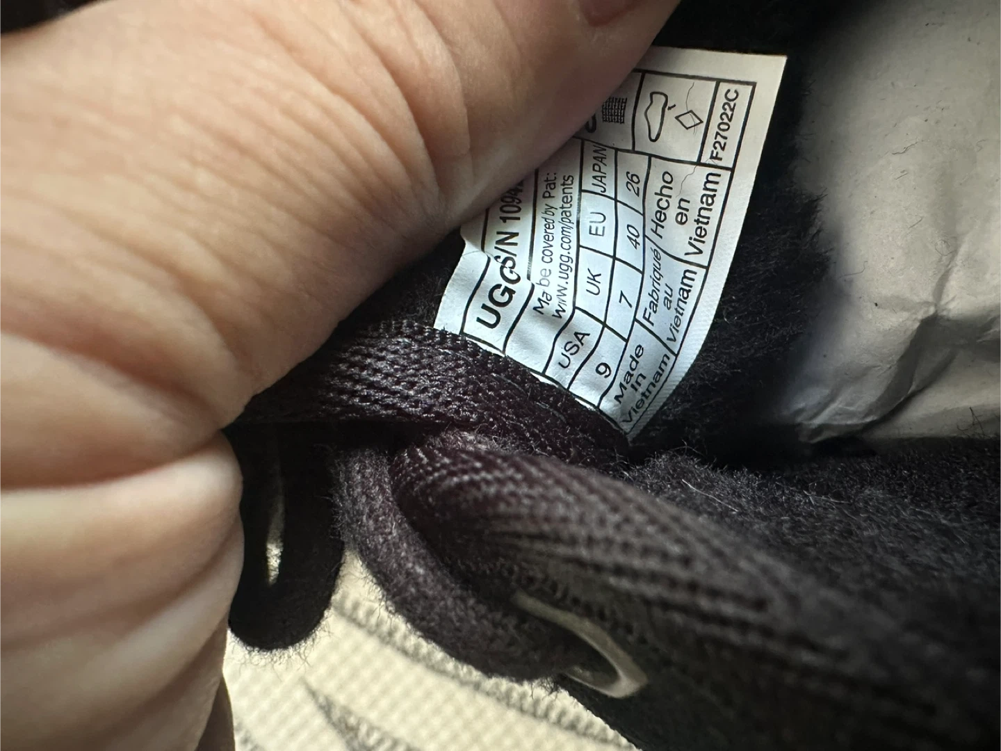 UGG Australia boots in black suede. These have a lace-up closure and a cozy interior lining. Includes original box.