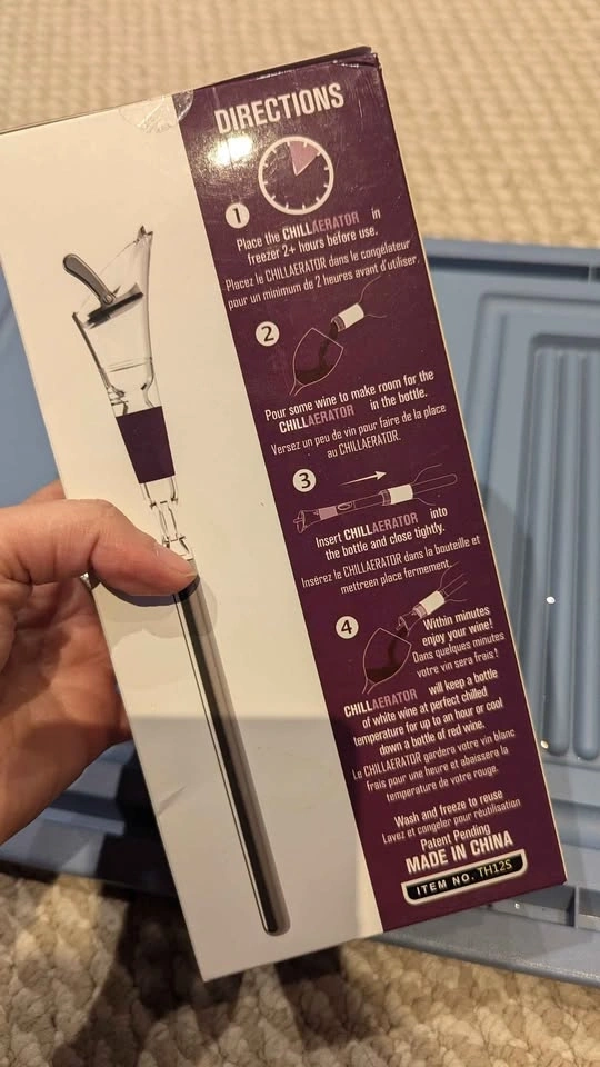Wine chiller and aerator in one – just freeze and pour. Chills wine instantly while pouring. Built-in aerator improves flavor. Fits standard wine bottles. Great for red & white wines. Like new condition, in original packaging. Perfect for wine lovers, easy entertaining, or as a gift idea.