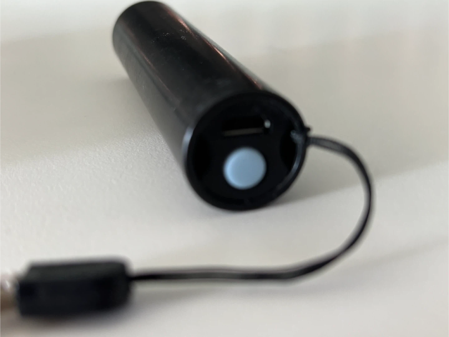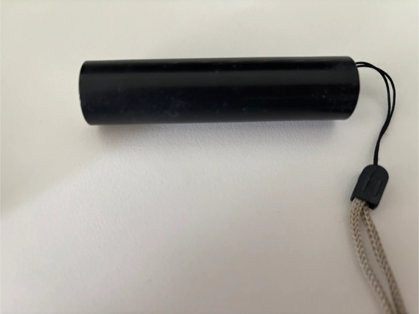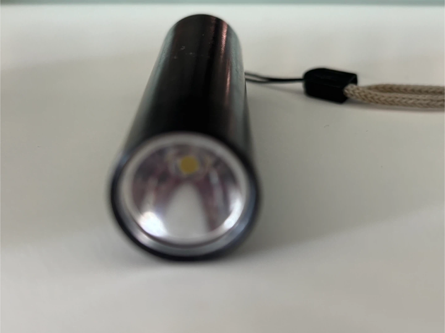This is a compact black LED flashlight. It's made of durable metal and comes with a convenient lanyard for easy carrying. The USB charging port is located at the end for simple recharging.