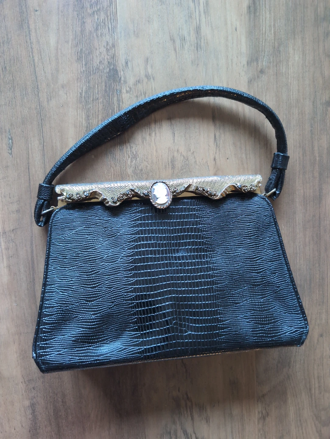 Vintage Black Faux Reptile Skin Handbag with Cameo Clasp