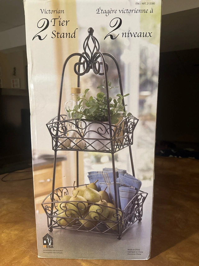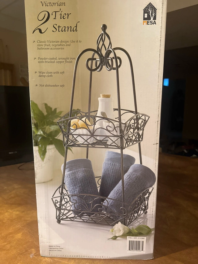 This Victorian 2-tier stand is perfect for adding a touch of elegance to your kitchen or bathroom with its classic design. The powder-coated, wrought iron with brushed copper finish ensures durability and style. Perfect for storing fruits, vegetables or bathroom accessories. This item is in like new condition, with no visible wear or tear, ready to enhance your home decor! * Classic Victorian design * Powder-coated, wrought iron with brushed copper finish * Wipe clean with soft damp cloth * Not dishwasher safe Transform your space with this lovely stand. If the ad is up, the item is available! I am asking $40 for this item, based on similar items sold on Kijiji.