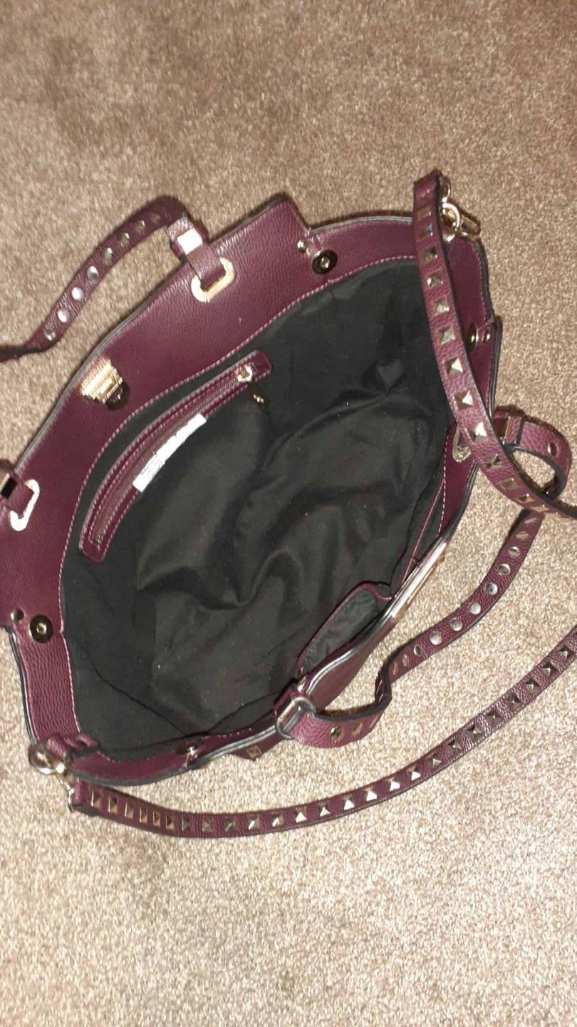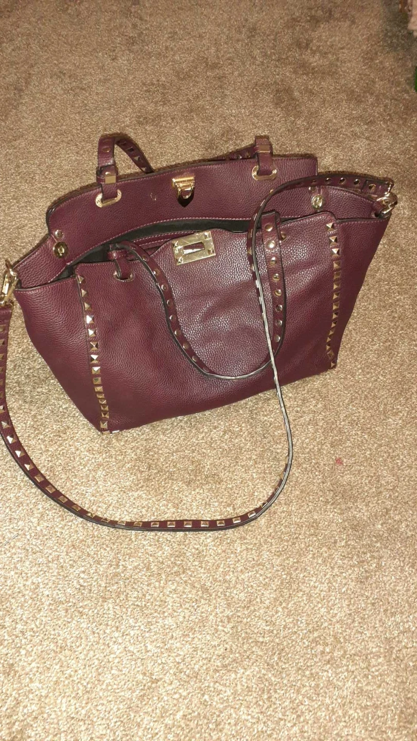Like New!! Stylish burgundy satchel handbag with gold-tone pyramid studs. It's got a zip closure and an optional shoulder strap. Plenty of space inside for your essentials! Price New $120. Faux Leather.