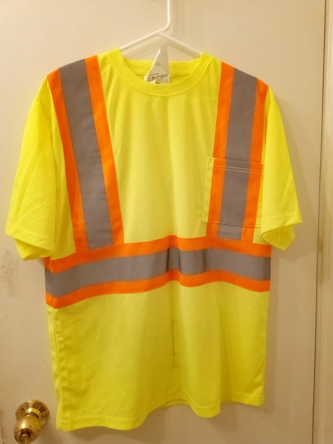 This is a yellow high-visibility short-sleeved t-shirt. It's made with a mesh fabric and features orange and silver reflective stripes. There's also a handy chest pocket.