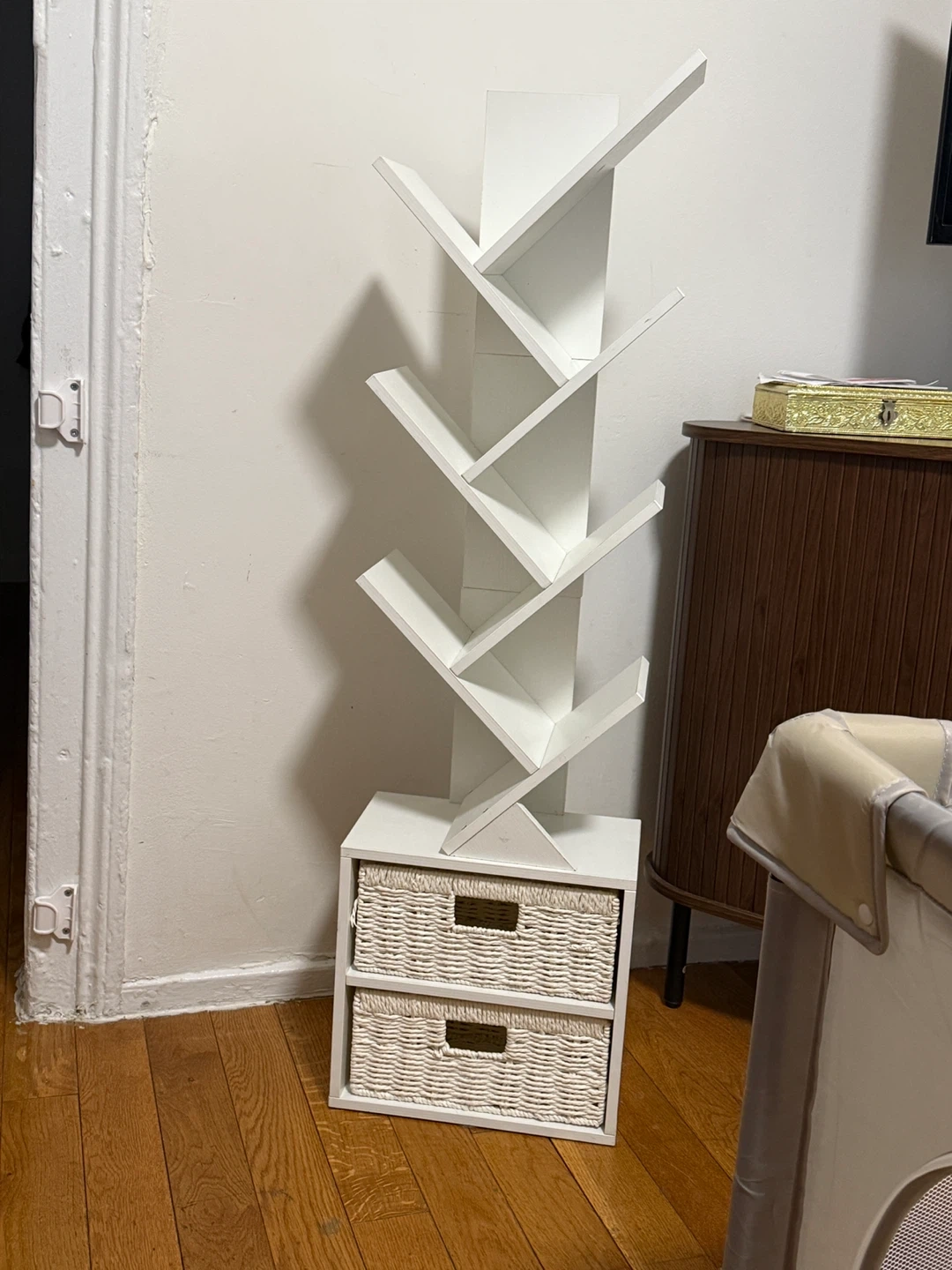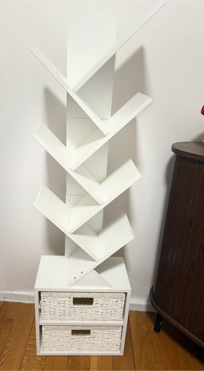 This white tree-shaped bookshelf offers a unique design with multiple shelves. It includes two woven storage baskets at the base for added organization. Made of durable material.