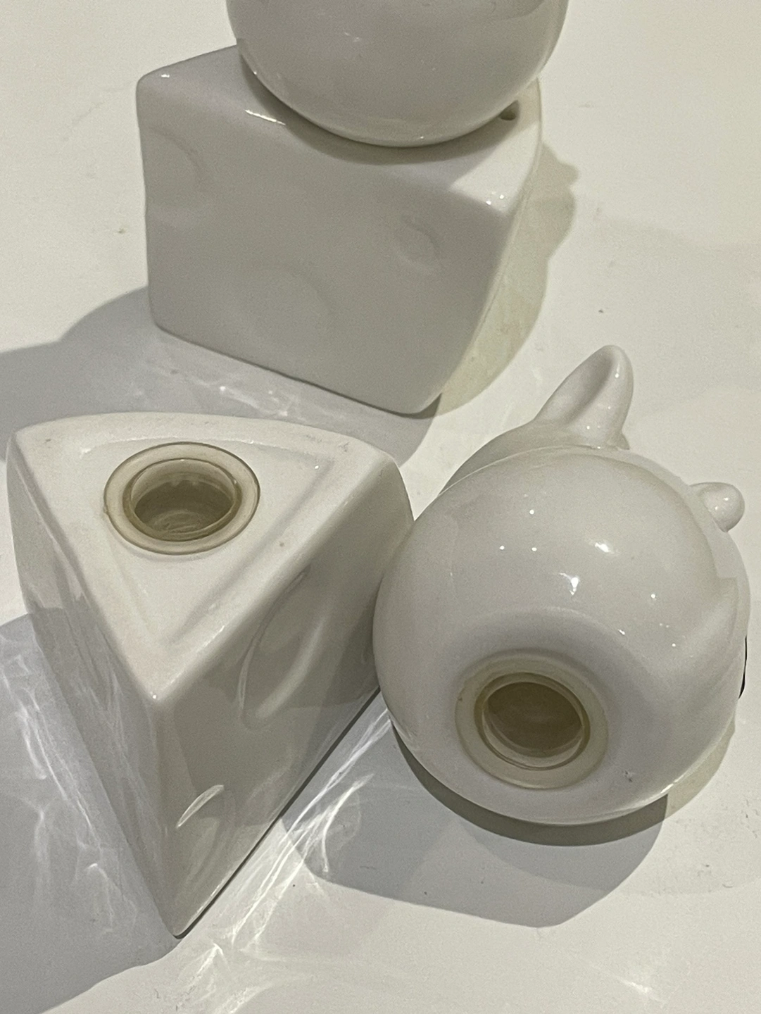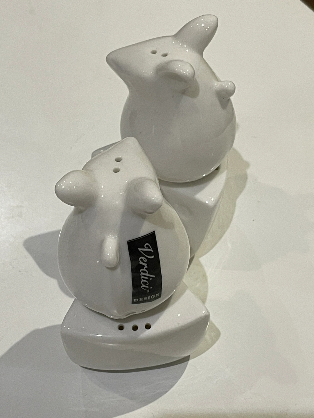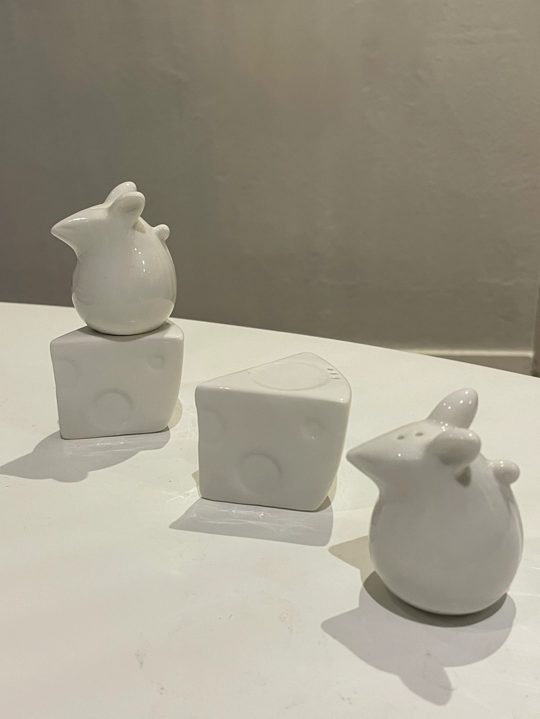 Set of white ceramic salt and pepper shakers in the shape of mice and cheese wedges