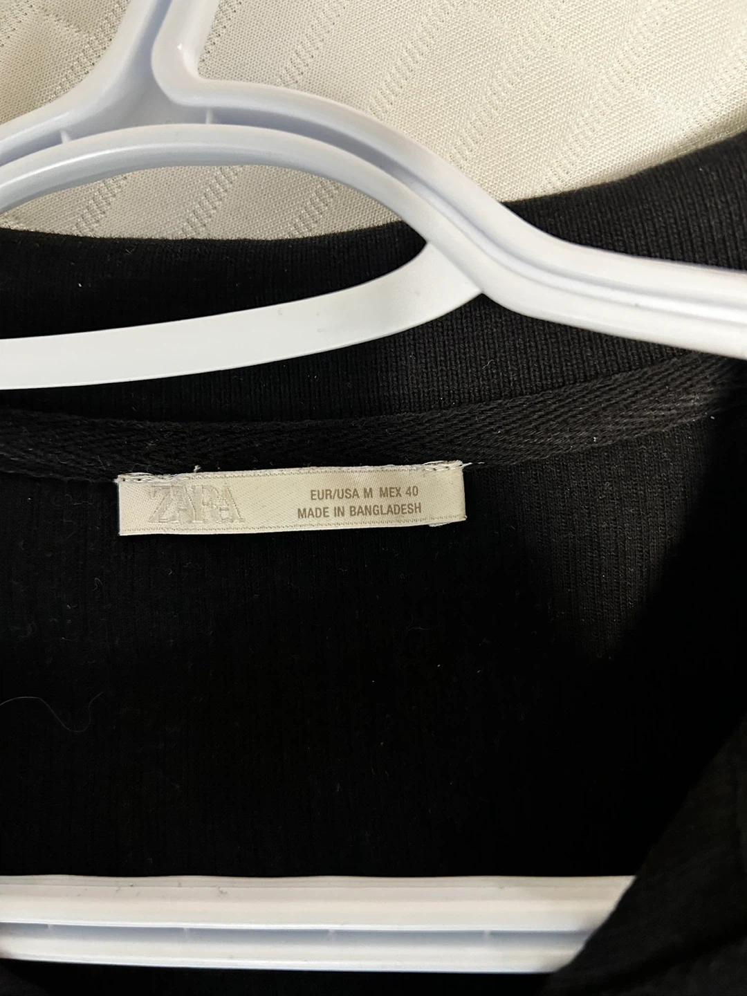 This is a black short-sleeved collared shirt from Zara. It's a size medium and made with a ribbed fabric. The shirt was made in Bangladesh.