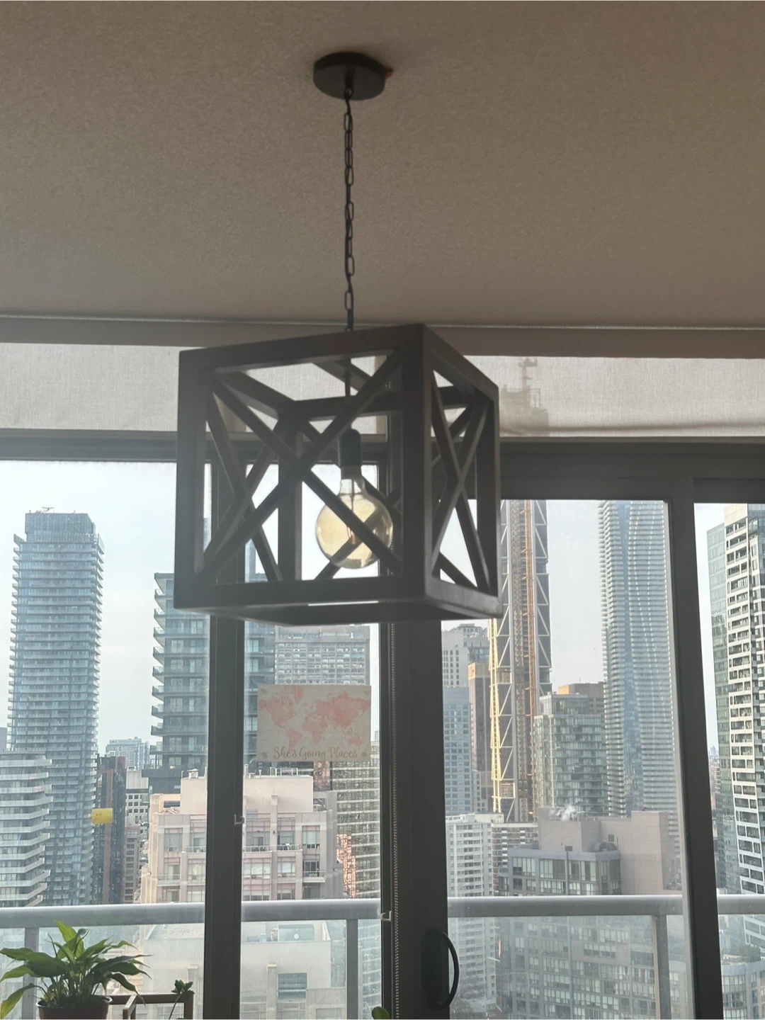 This pendant light features a unique open wood cube design with a rustic finish. It's perfect for adding a touch of industrial charm to any room. The light fixture hangs from a metal chain and includes a visible Edison-style bulb.