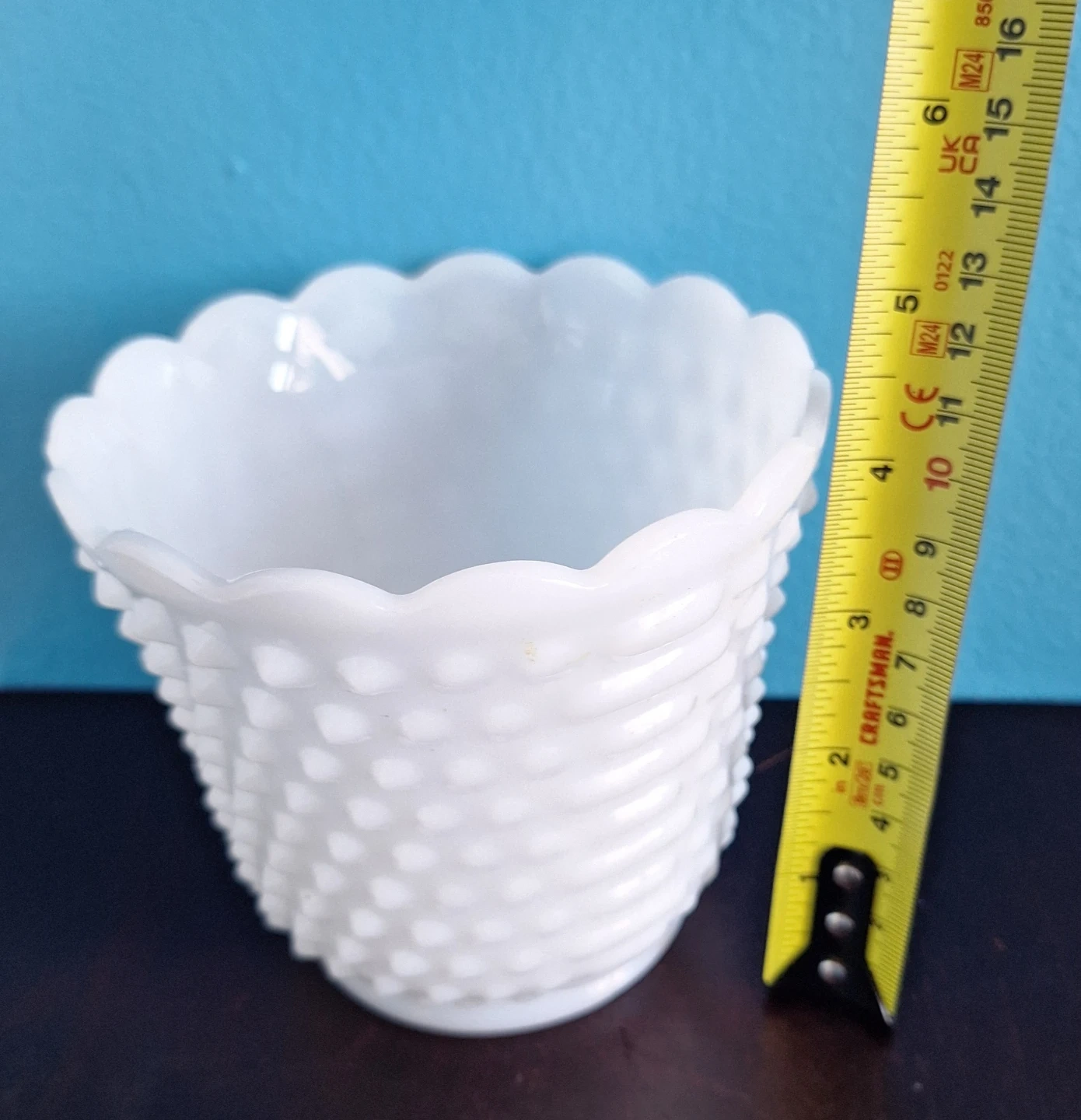 This is a set of two white milk glass planters. They have a hobnail pattern and a scalloped rim. Made in USA by Anchor Hocking in 1960s
