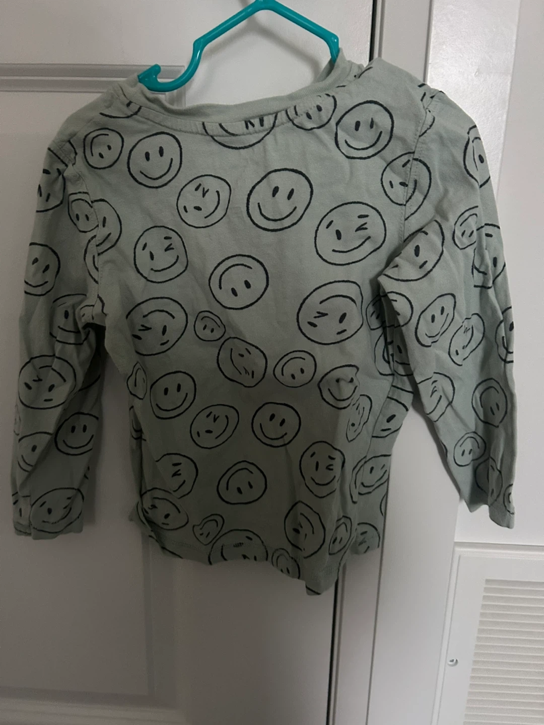 This long-sleeved t-shirt has a repeating pattern of black smiley faces on a light blue background. It's a fun and casual top for everyday wear. The material is soft and comfortable for children.