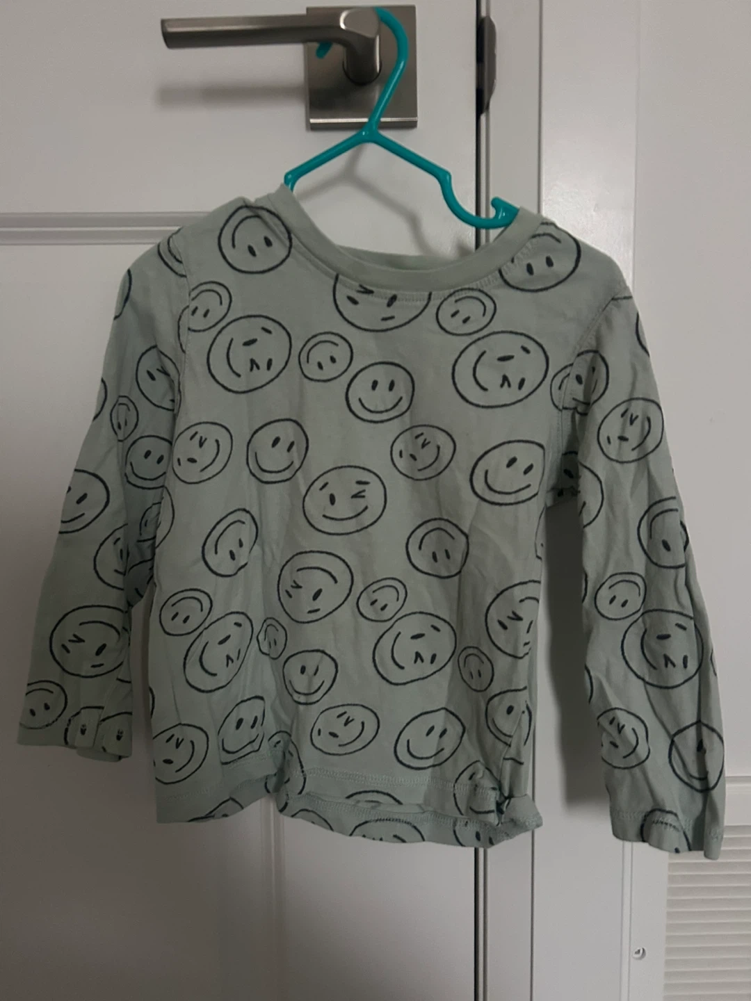 This long-sleeved t-shirt has a repeating pattern of black smiley faces on a light blue background. It's a fun and casual top for everyday wear. The material is soft and comfortable for children.