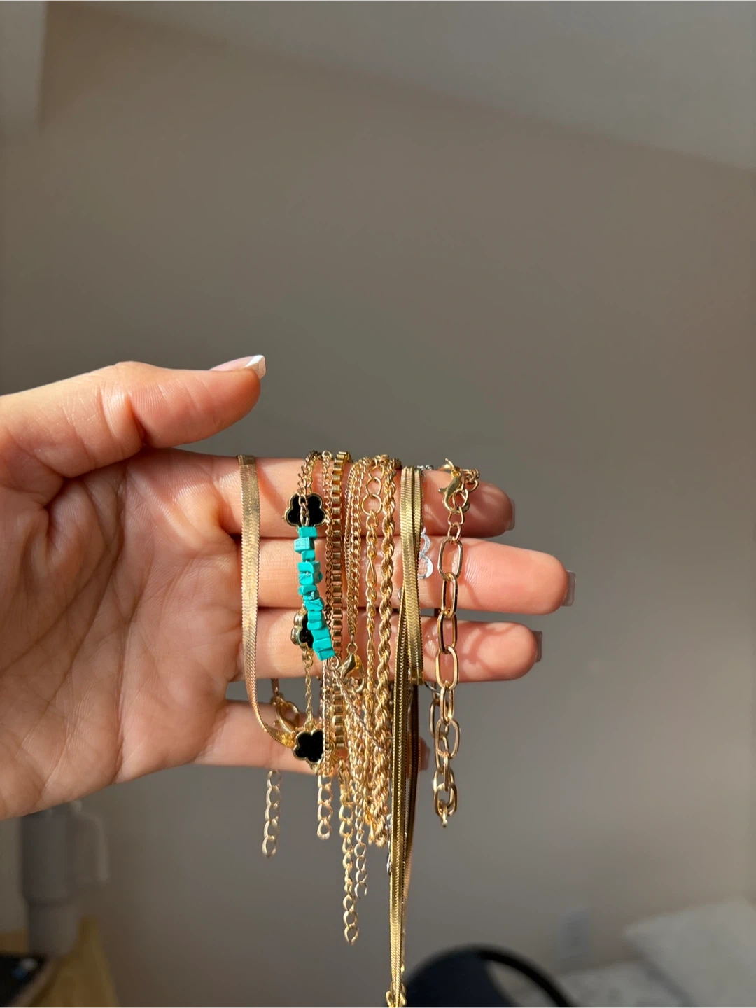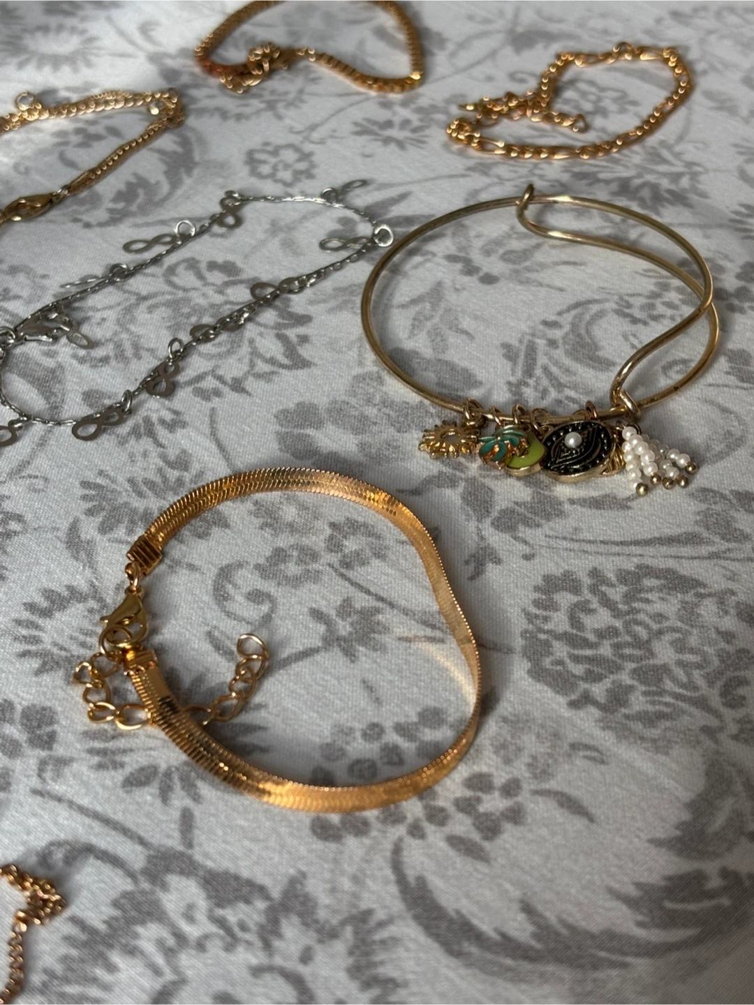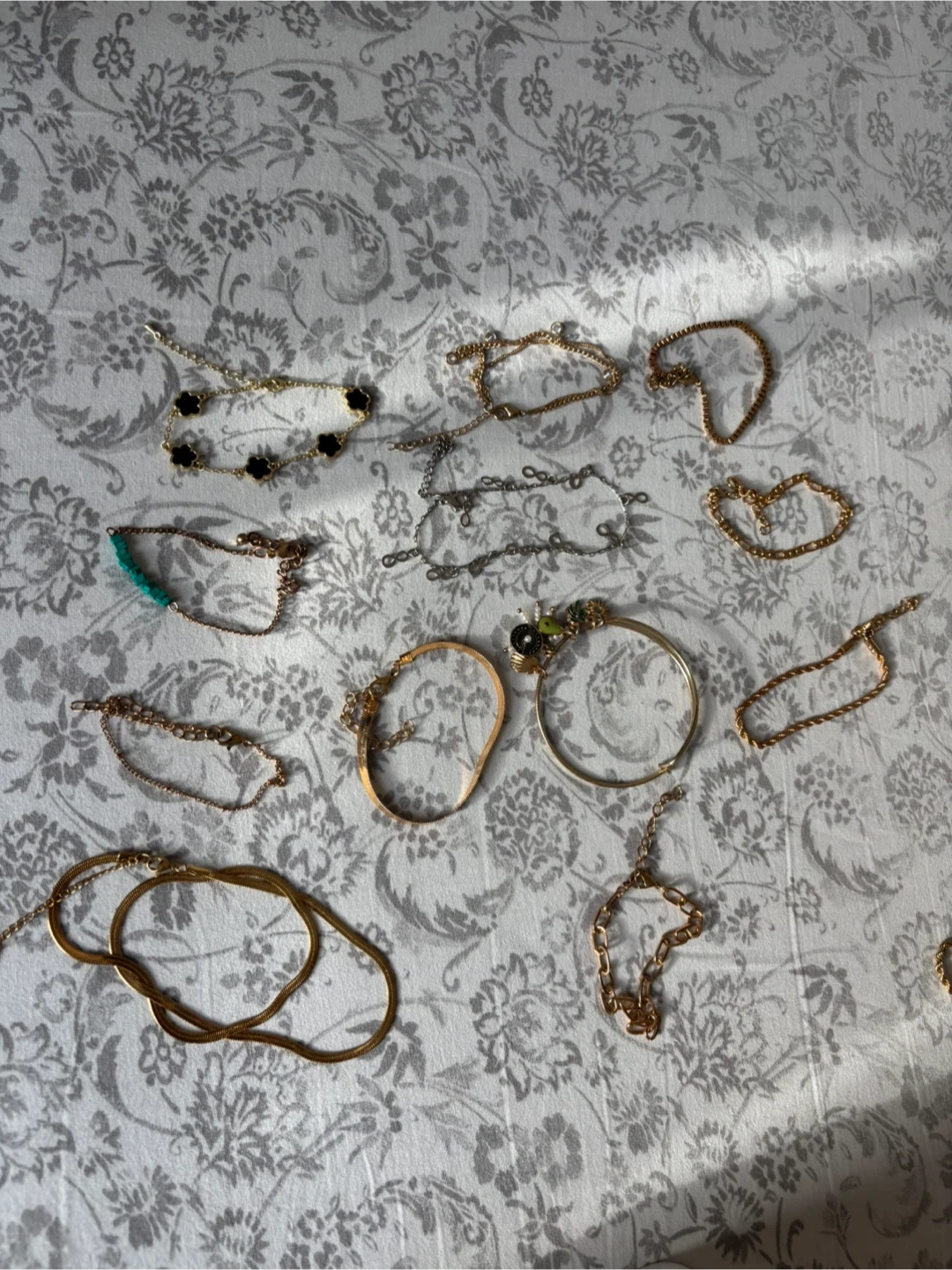 Bundle of various bracelets. Includes gold-tone and silver-tone pieces with charms and decorative elements. Great for layering or mixing and matching.