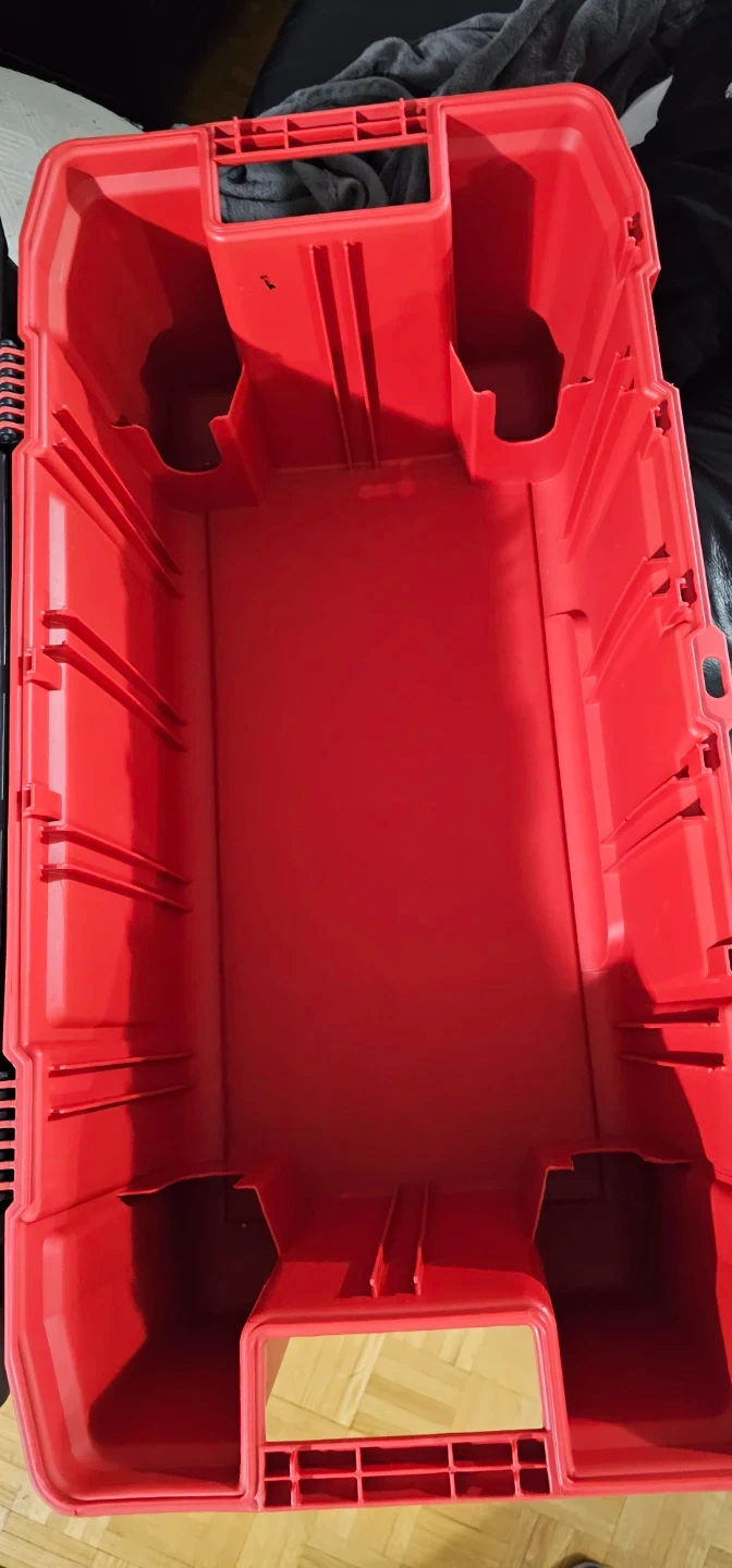 This Milwaukee tool box is red and black. It's made of durable plastic construction. Great for storing and transporting your tools!