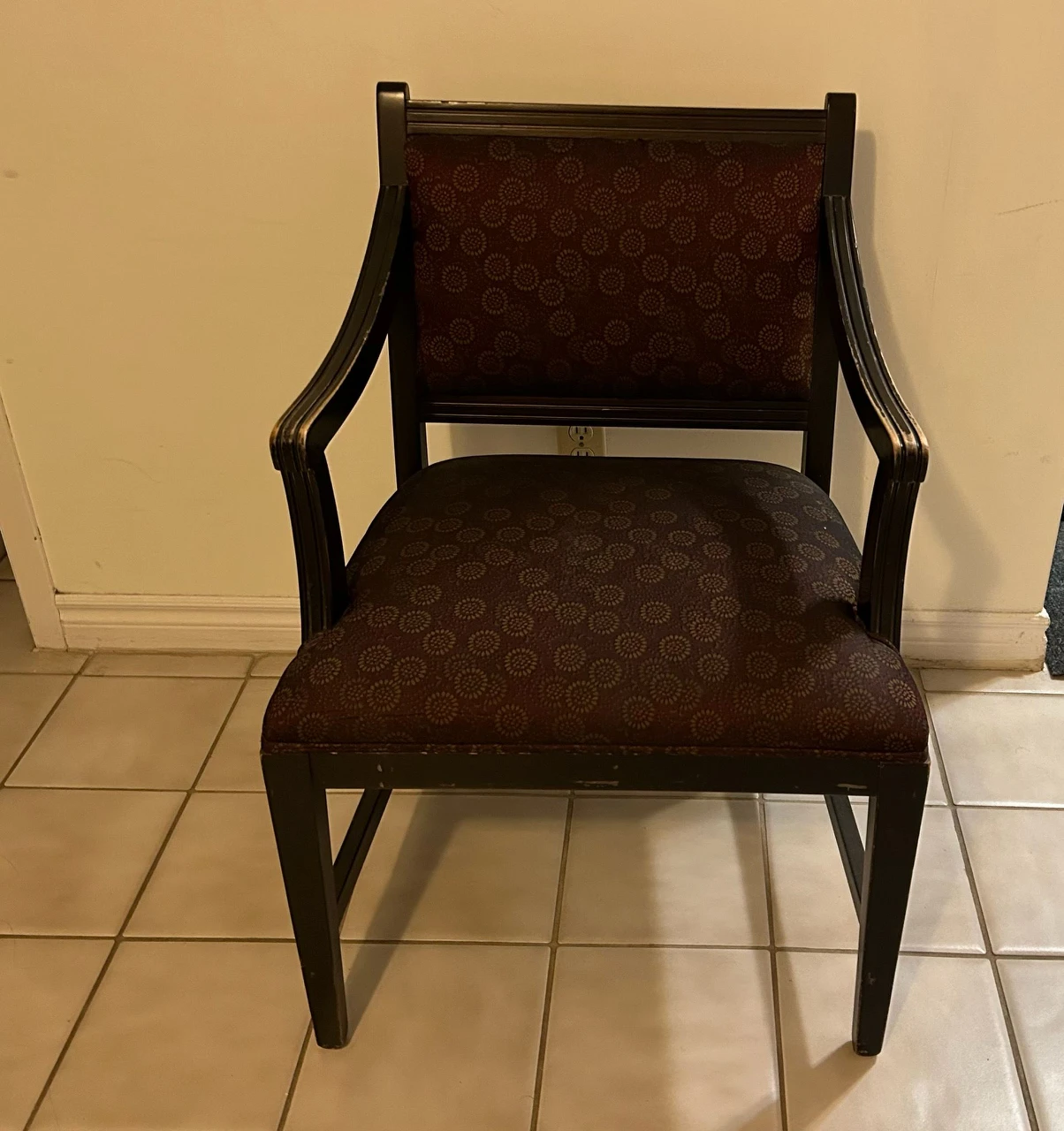 Two antique armchairs available, both are identical. Fabric in great condition, can touch up stain easily.