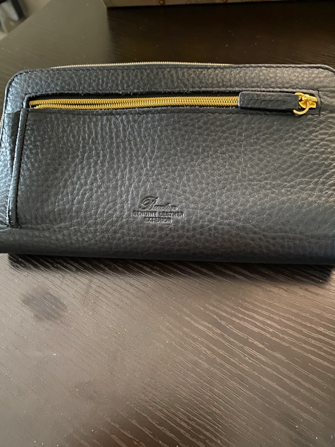 This Burton zip-around wallet is made from genuine black leather. It features multiple card slots and a zippered coin pocket. It's a classic and functional accessory for organizing your essentials.