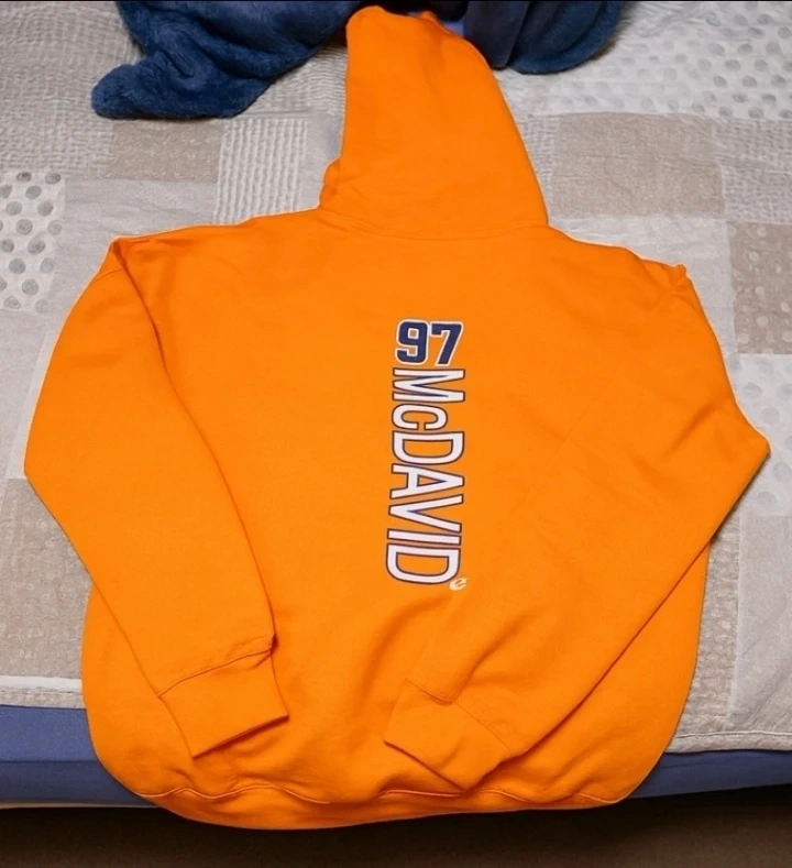 Orange hooded sweatshirt featuring the Edmonton Oilers logo on the front. The back displays '97 McDAVID' in large print. It's a great way to show your support for the team!