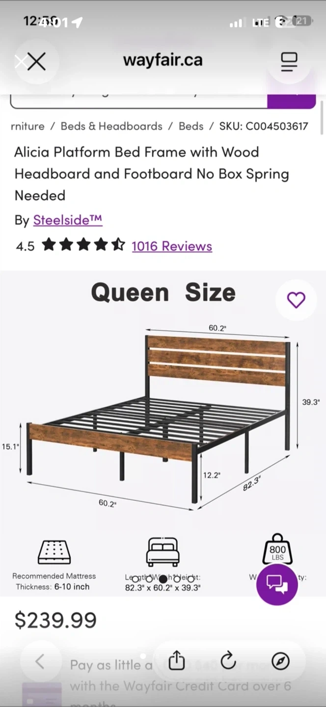 Selling a Steelside Alicia platform bed frame in queen size. It features a wood headboard and footboard. The dimensions are 82.3" x 60.2" x 39.3". Doesn’t fit in my new space Originally bought for $239.99. Need it to go asap.
