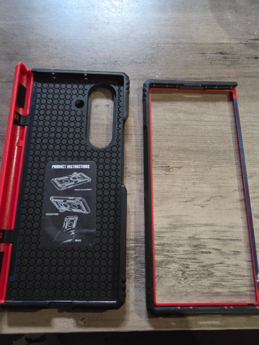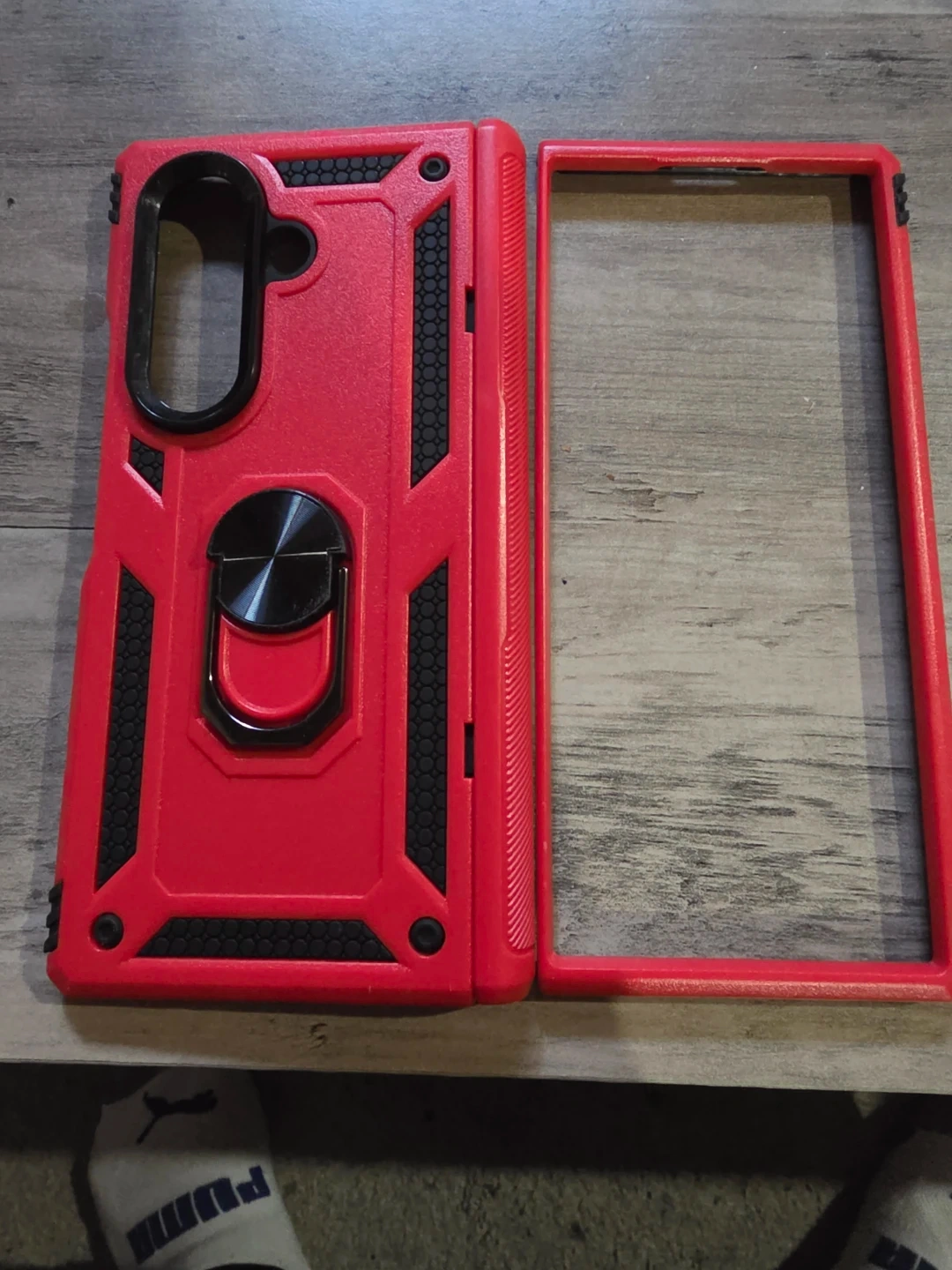Selling a red phone case for a Samsung z 7 fold phone. It has a kickstand and a ring for easy holding. It appears to be in good condition and comes in two parts.