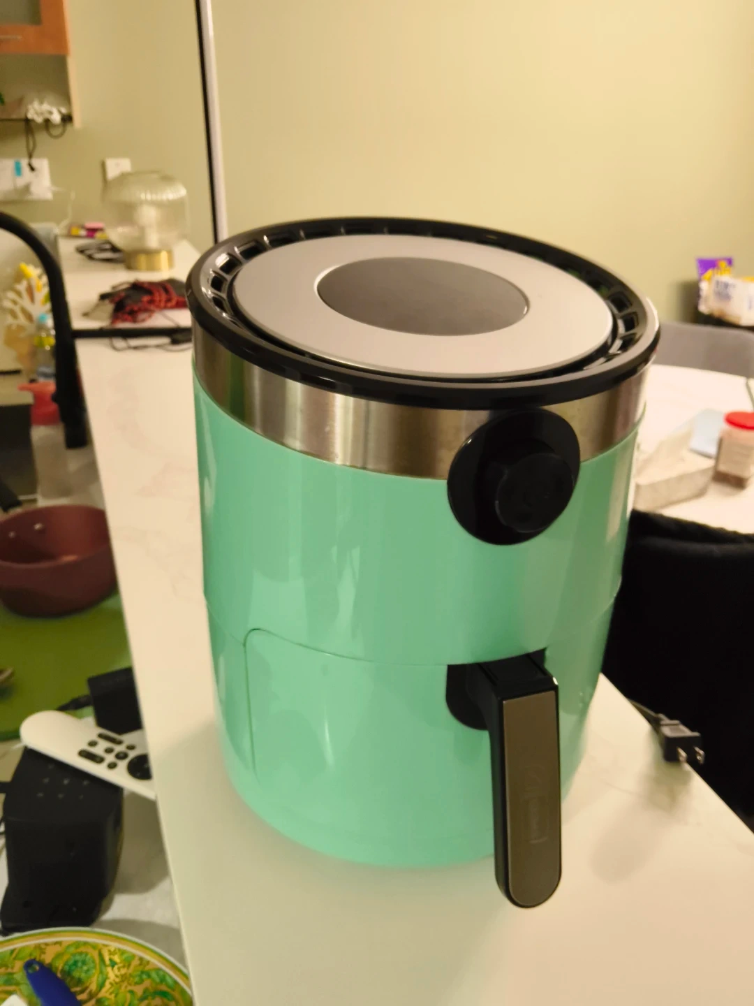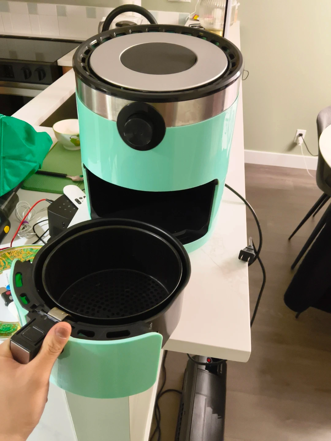 This aqua-coloured air fryer comes with a detachable basket for easy cleaning. It's a convenient appliance for quick meals. Perfect for fries, chicken, and veggies!