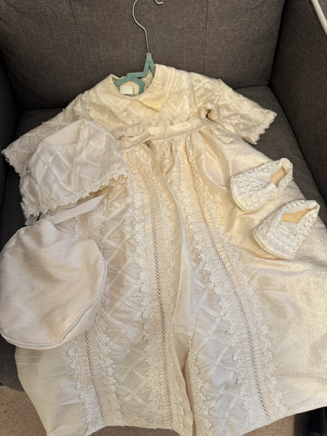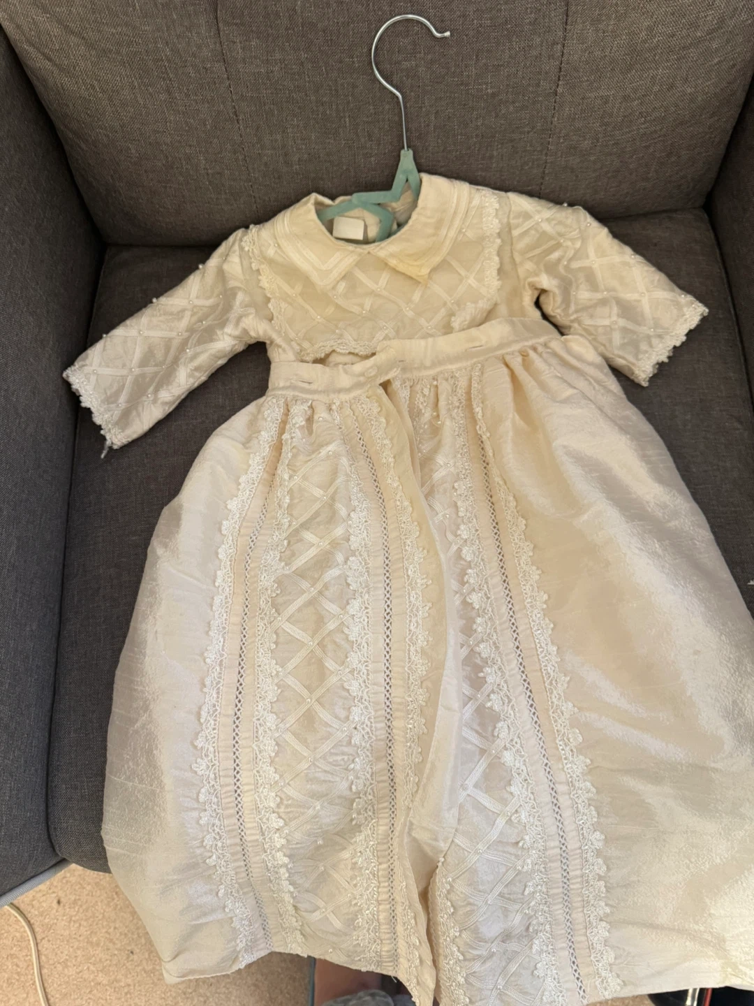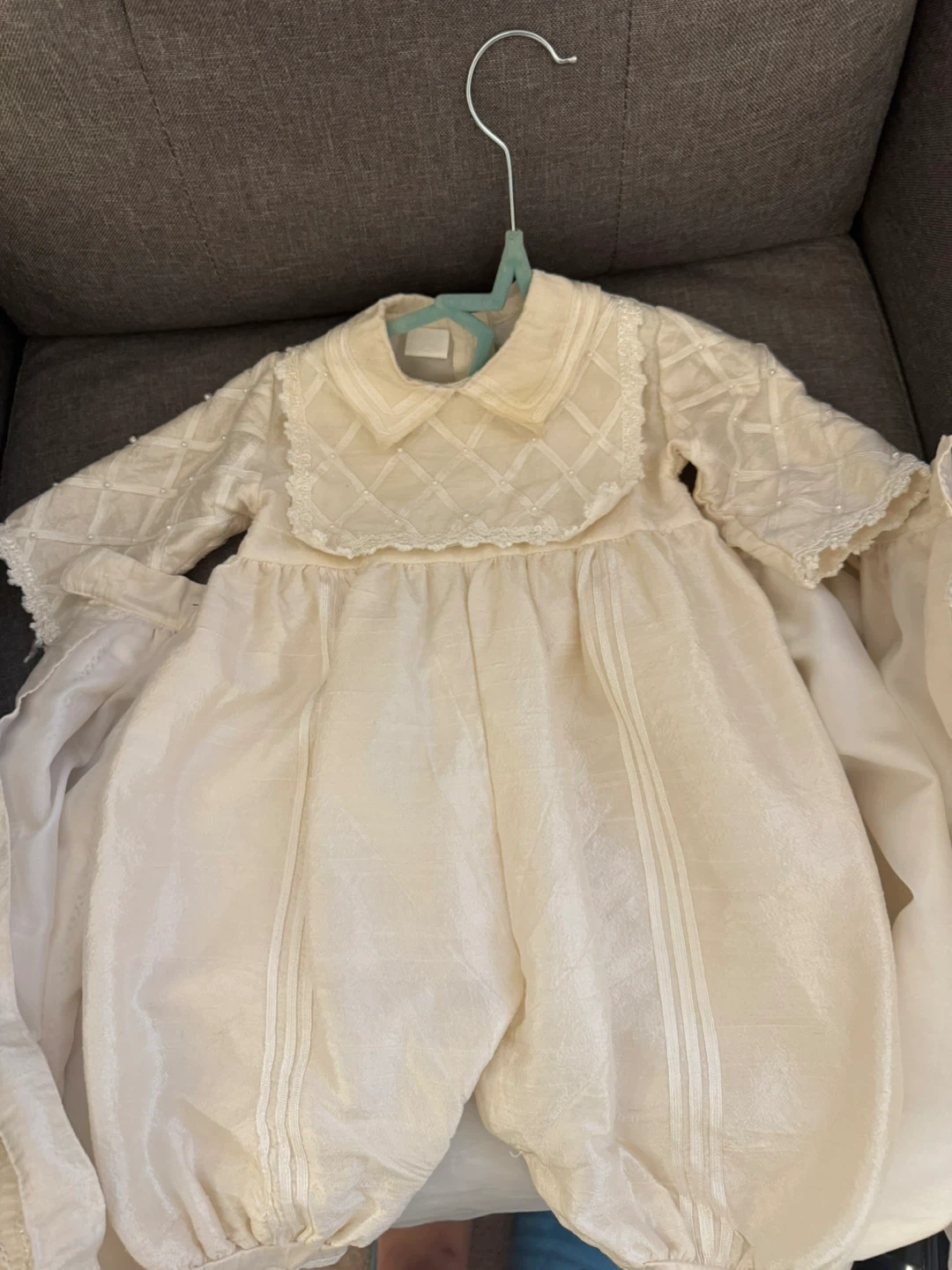 Selling a beautiful baby christening outfit in ivory! It includes the gown, bonnet, and booties. The gown has a detachable bottom, so it can be worn as a romper as well. Perfect for a special occasion!