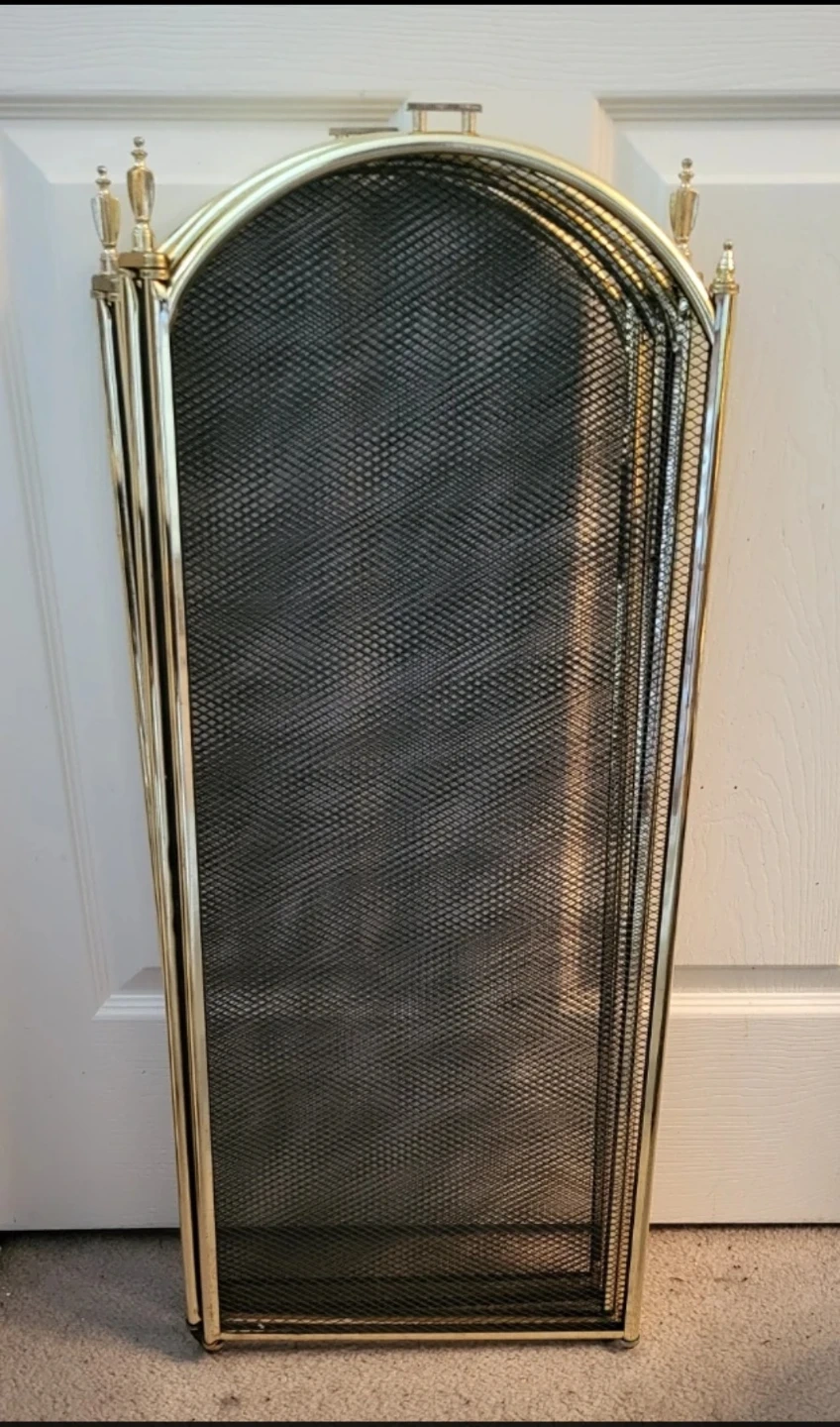 A folding fireplace screen with a brass finish and mesh panels. It folds compactly for easy storage. Great for keeping sparks contained while adding a touch of elegance to your hearth!